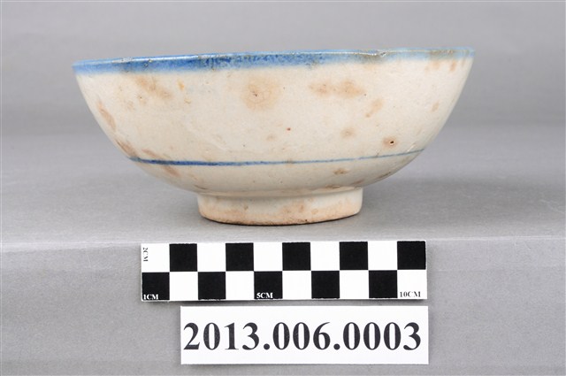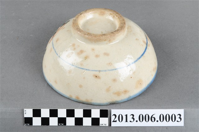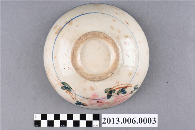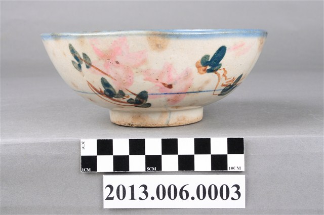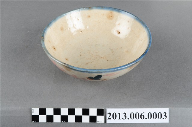 本件文物應屬於湯碗,敞口、碗底較淺,碗口施以青色釉彩,器身以紅花綠葉裝飾,臺灣早期碗盤的釉色多採青色、墨色或褐色,後來出現粉紅色的色料之後,臺灣的碗盤喜用粉紅色料上釉,使得陶瓷碗盤上的顏色變得豐富起來,一般俗稱「胭脂紅」。臺灣的陶瓷的製作廠商為了提升產品的價值就多繪幾朵粉紅色的花朵,業者便以「一朵花」、「二朵花」、「三朵花」來區別這些產品。這件湯碗就是「二朵花」。