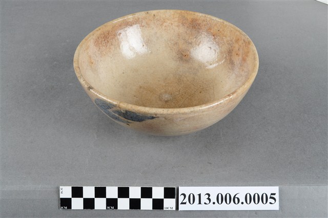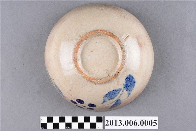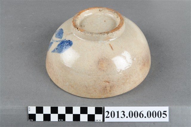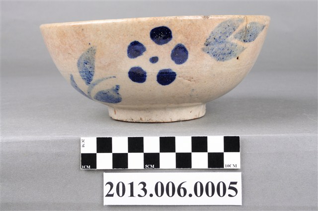 本件青色花卉紋湯碗,戰後臺灣碗盤的製作兩大產地主要是北投與鶯歌,在瓷器尚未普及之前,臺灣的碗盤大多是陶製,北投是臺灣最早發展出機器製作的技術,而戰後鶯歌的碗盤業急遽發展,除了坯體的製作之外,聘請大量的女工進行碗盤圖案的繪製,而許多碗盤的圖案很簡單許多女工只要稍加訓練即可勝任,本件文物上簡單的彩繪花卉,應適量產下由女工彩繪,簡單的青色花紋顯示出早期臺灣碗盤的樸素的風格。本件文物正可以見證臺灣碗盤彩繪的歷程。
