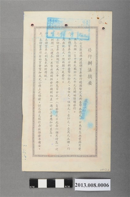 2、建設儲蓄券發行總額新臺幣3億元,分為有息無獎與有獎無息;面額有新臺幣50元、100元、500元、1000元、10000元,均為無記名式。本件為有息無獎的1萬元儲蓄券。