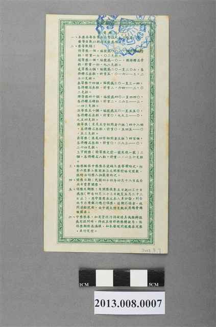 2、救災獎券由中國大陸災胞救濟總會主持,委託臺灣銀行發行每張新臺幣5元、共計80萬張、4百萬元的一次獎券;於1955年4月18日開獎,有特、頭、貳、叁、肆、伍、陸、柒及上下附獎(特獎前後號),均以鑽石支付,故名鑽石獎券。