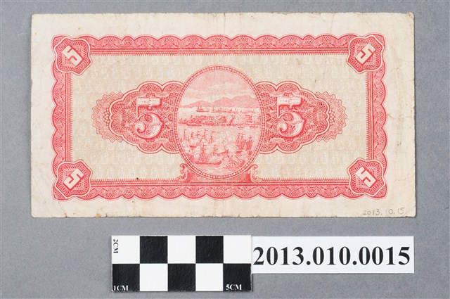 1.此貨幣正面為孫文先生圖像及臺北市重慶南路的臺灣銀行建築,右邊為臺灣圖樣上有台幣字樣,背面為鄭成功與荷蘭海戰圖。這類台幣面額有1、5、10、50、100、500圓六種。舊台幣並未發行壹圓以下面額硬幣,沿用日本時代貨幣(以上根據捐贈者筆述)。