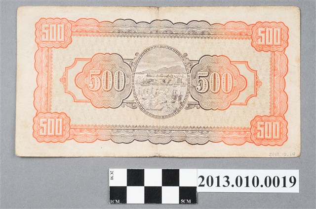 1.此貨幣正面為孫文先生圖像及臺北市重慶南路的臺灣銀行建築,右邊為臺灣圖樣上有台幣字樣,背面為鄭成功與荷蘭海戰圖。這類台幣面額有1、5、10、50、100、500圓六種。舊台幣並未發行壹圓以下面額硬幣,沿用日本時代貨幣(以上根據捐贈者筆述)。