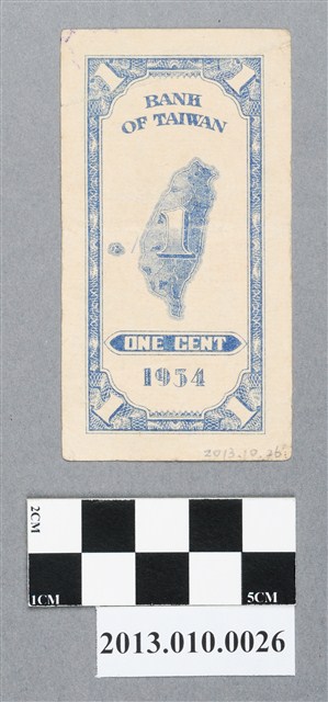 2.本版為1954年發行,正面為臺灣銀行圖樣,每拾分兌壹角,中華民國四十三年印,臺灣銀行,背面為臺灣地圖上有1字樣,並有英文表示one cent 及BANK OF TAIWAN。