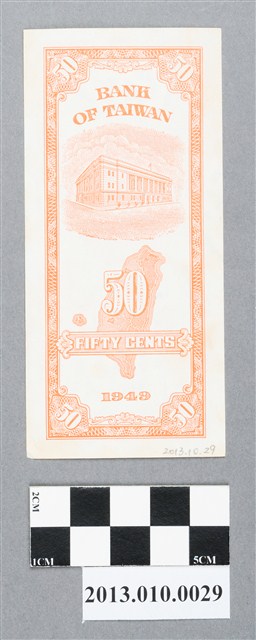 2.本版為1949年7月5日發行,正面為臺灣孫中山圖樣,每拾角兌壹圓,中華民國三十八年印,臺灣銀行,背面為臺灣地圖上有50字樣,並有英文表示fifty cents 及BANK OF TAIWAN。