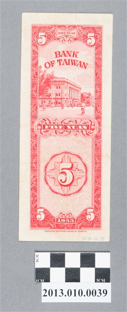 2.本版為1956(民國45)年2月9日發行,正面為孫中山圖樣,中華民國四四年版,臺灣銀行,背面為上方為臺灣銀行圖樣,下方為臺灣地圖上有1字樣,並有英文表示five yuan 及BANK OF TAIWAN。壹圓券為正面凹印、背面平印,悚色字樣