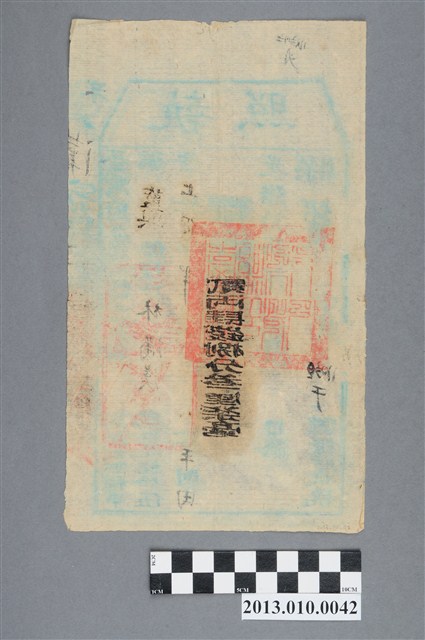 為臺灣府臺灣縣正堂(此臺灣縣為中部的臺灣縣)某(字跡不詳),發給藍興堡林滿漢完稅的執照(證明)
