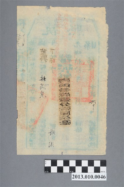 為臺灣府臺灣縣正堂(此臺灣縣為中部的臺灣縣)黃承乙,發給藍興堡林滿漢完稅的執照(證明)。上另有紅色字樣書寫:全年完糧銀壹兩,隨捐文武試院等工程經費七兌洋貳角五點此照。