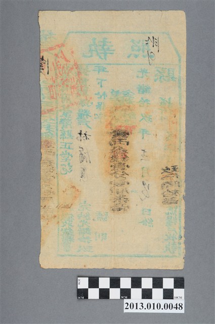 為臺灣府臺灣縣正堂(此臺灣縣為中部的臺灣縣)范克承,發給藍興堡林滿漢完稅的執照(證明)