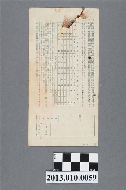 臺灣產業金庫發行之奉公債券,此為第一回,上有編號ろの組NO.086633,並有附券。抽籤日期為昭和19年(1944年)12月25日