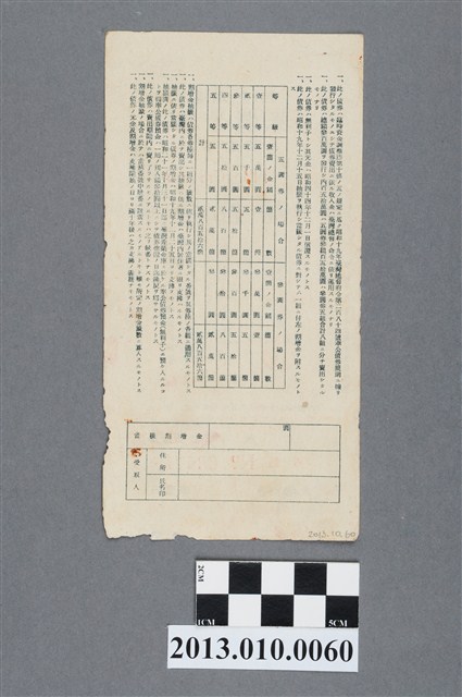 臺灣產業金庫發行之奉公債券,此為第一回,上有編號ろの組NO.086633,並有附券。抽籤日期為昭和19年(1944年)12月25日
