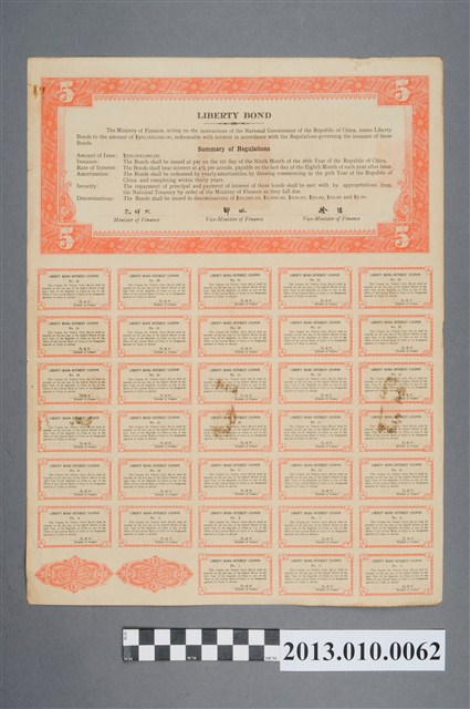 財政部在1937年奉國民政府核准發行救國公債5萬萬元(5億),分三十年還清,每年八月底付息一次,每年抽籤還本一次,分三十年還清,下方有付息的息票,僅有50年後部分。惟此年發行公債業已提前清償,並於1948年九月行政院據以訂定「政府法幣公債處理辦法」規定:政府歷年發行之法幣公債實銷部分尚未清償者,一律定於民國三十七年十月一日起,開始提前清償,持票人應於民國三十八年三月三十一日前 (後延長至四月三十日) 將債票持向各地經理銀行兌付,逾期未請兌領者,其所持之法幣公債一律 作廢。前述
