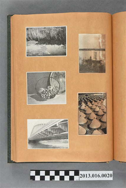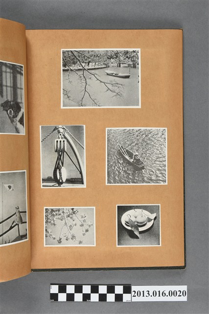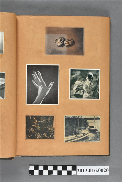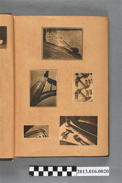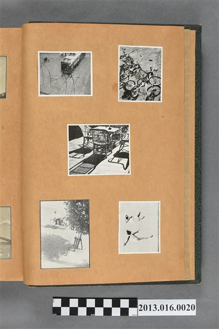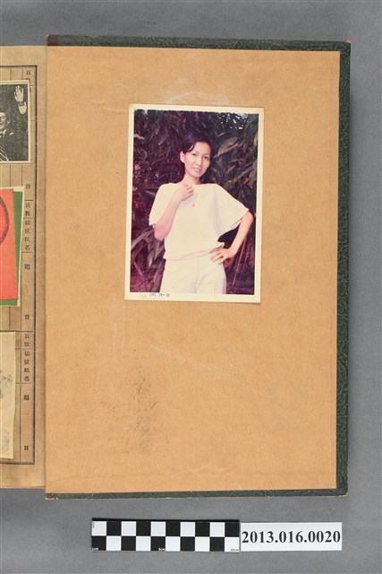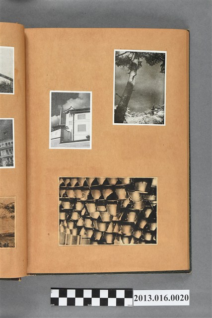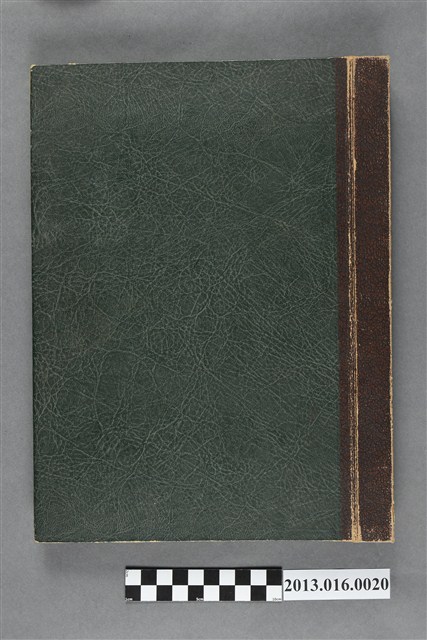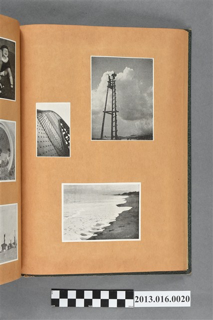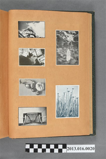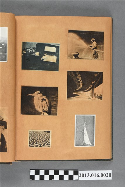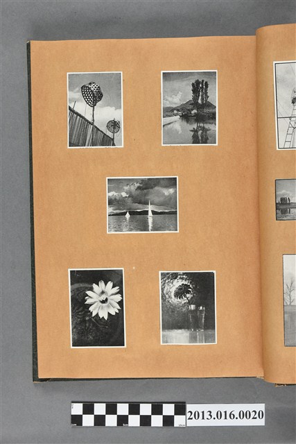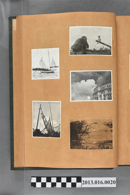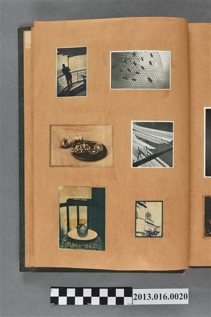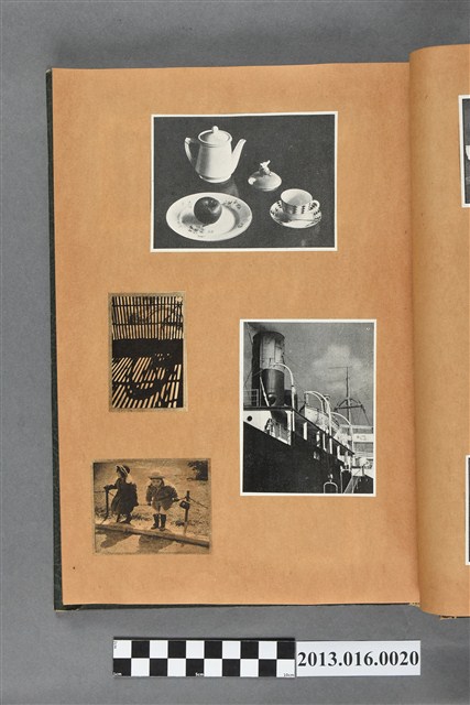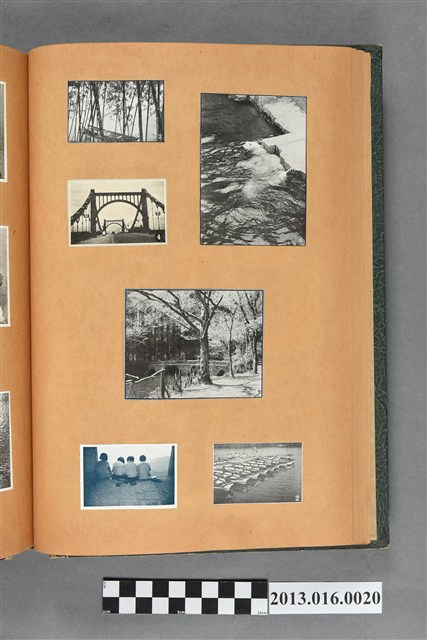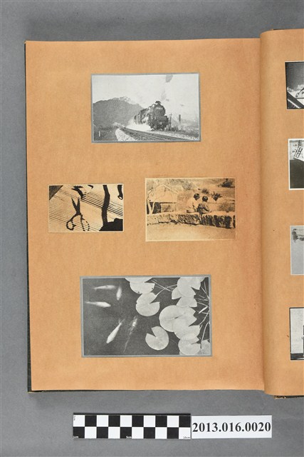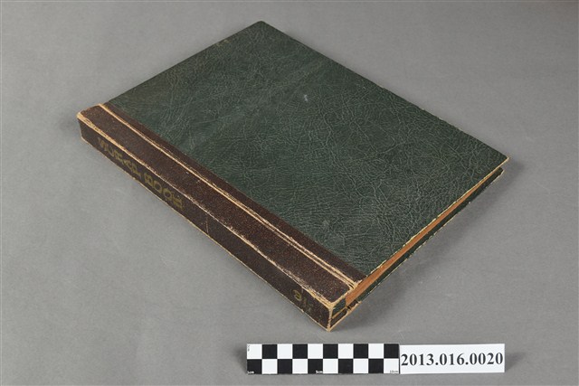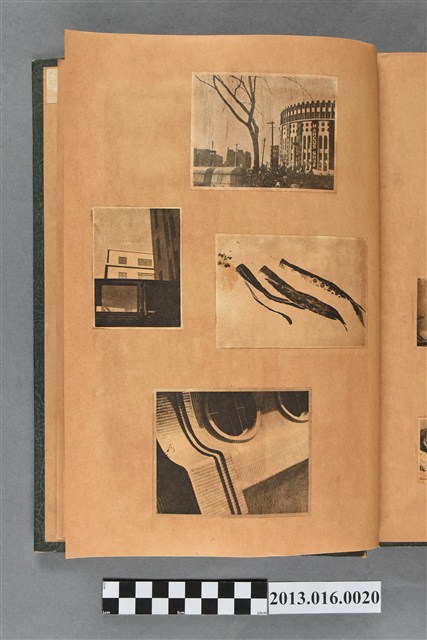 陳崧波文物之藍色書皮剪貼簿,書背燙金印「SCRAP BOOK」字樣。這本剪貼簿所貼內容主要來自出版印刷品。據捐贈者陳義鴻所述,主要是其父陳崧波將早年出版的「陳崧波寫真集」中剪貼而成,影像內容主要是日本時代至戰後初期陳崧波累積的攝影作品,其內容與物件編號「101082-0006」等50年代整理的相本有許多重疊,推測陳崧波1950年代確曾將其攝影作品集結發行,後來到1980年左右由於書籍保存不良,而將印刷品的攝影作品部分剪貼成冊,而空白部分則貼上1980年左右的照片或剪報,如一張雷根當選美國總統的剪報便貼在該剪貼簿中。