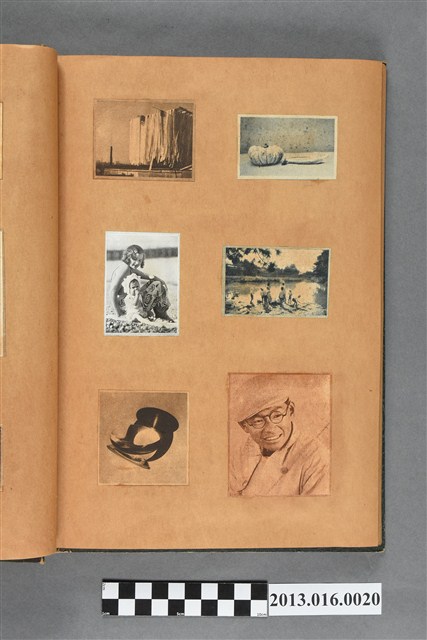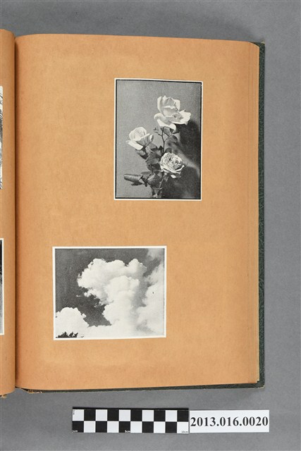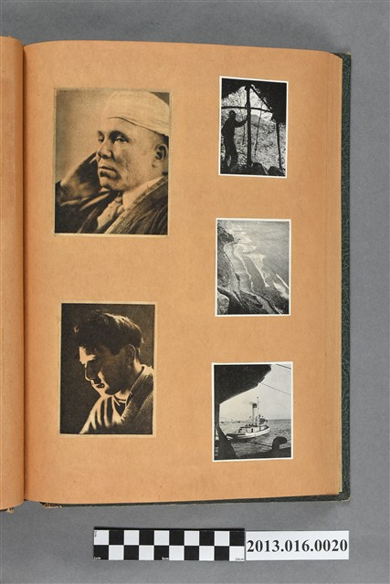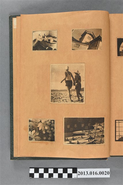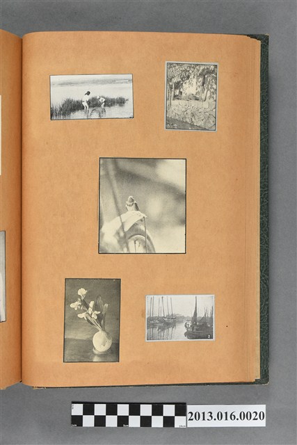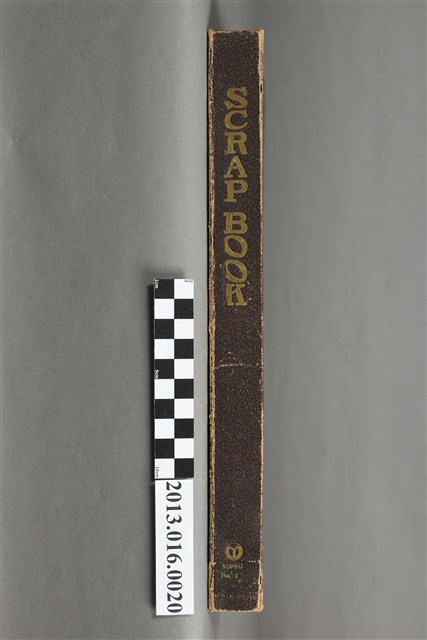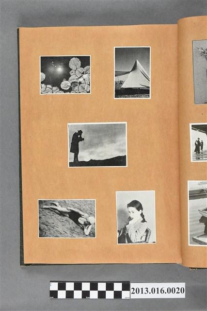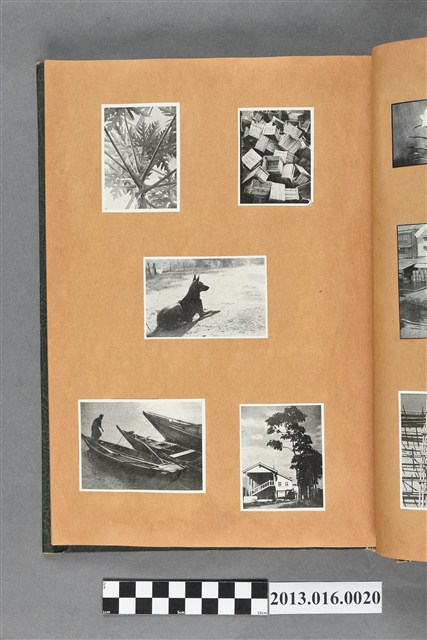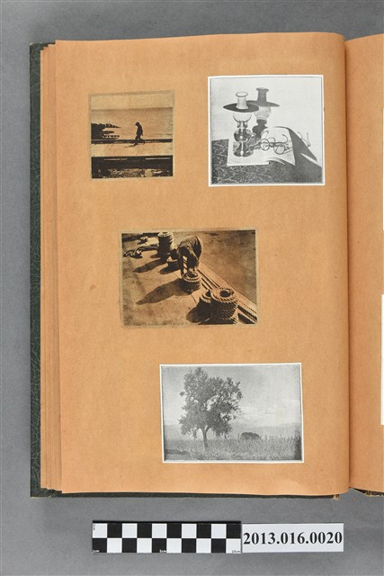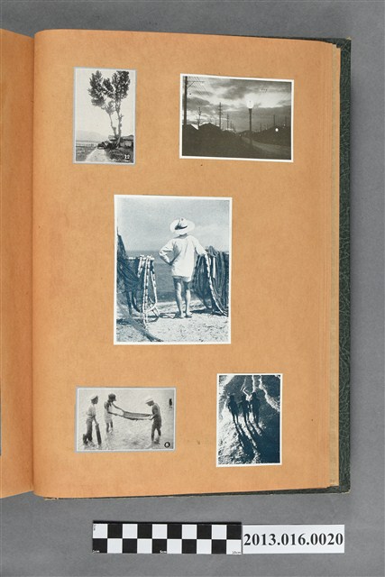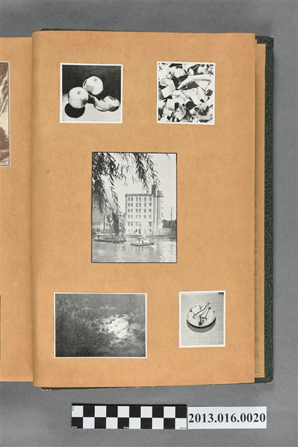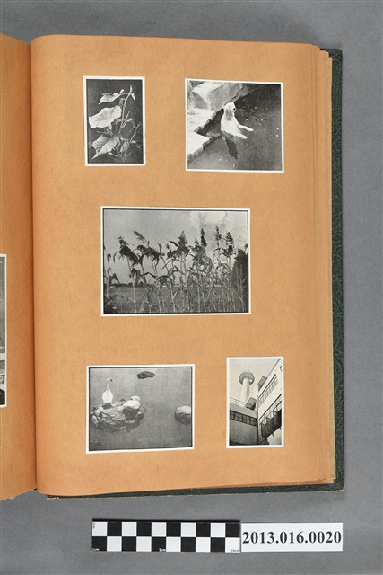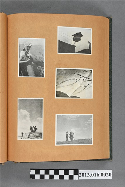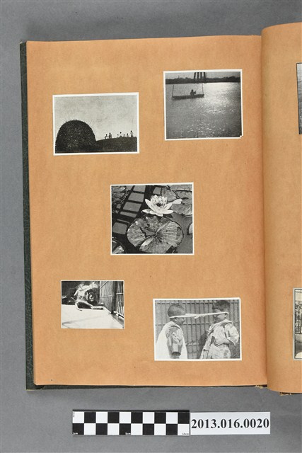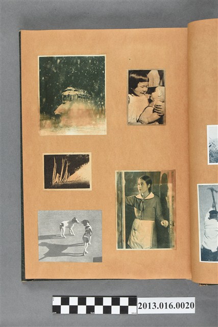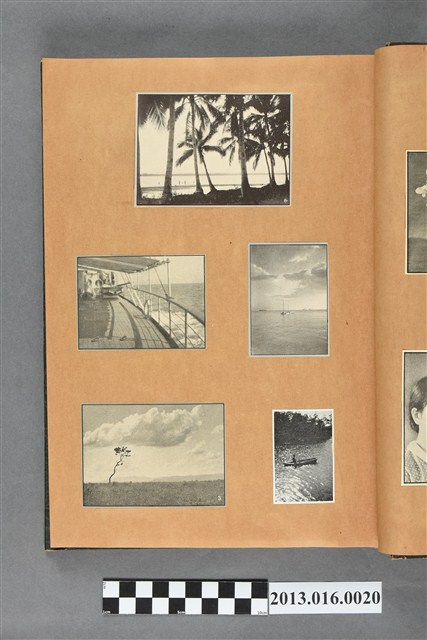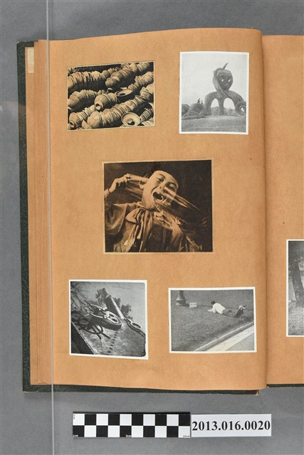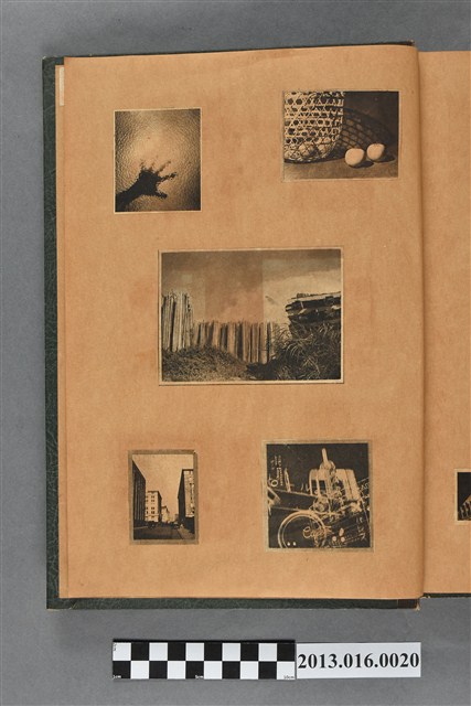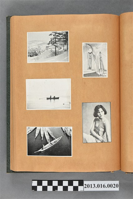 陳崧波文物之藍色書皮剪貼簿,書背燙金印「SCRAP BOOK」字樣。這本剪貼簿所貼內容主要來自出版印刷品。據捐贈者陳義鴻所述,主要是其父陳崧波將早年出版的「陳崧波寫真集」中剪貼而成,影像內容主要是日本時代至戰後初期陳崧波累積的攝影作品,其內容與物件編號「101082-0006」等50年代整理的相本有許多重疊,推測陳崧波1950年代確曾將其攝影作品集結發行,後來到1980年左右由於書籍保存不良,而將印刷品的攝影作品部分剪貼成冊,而空白部分則貼上1980年左右的照片或剪報,如一張雷根當選美國總統的剪報便貼在該剪貼簿中。