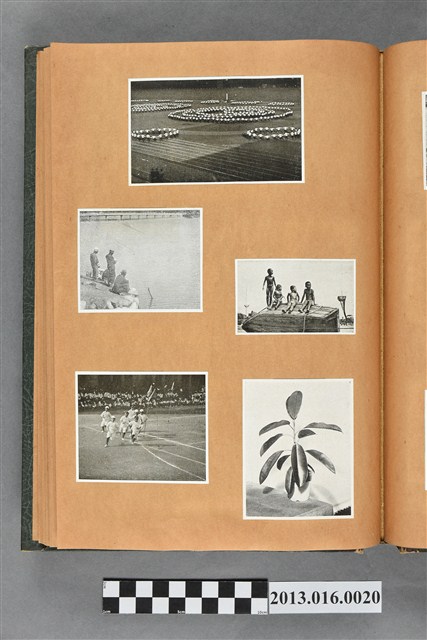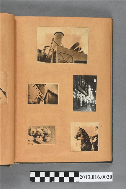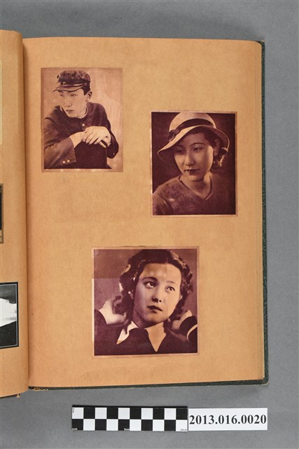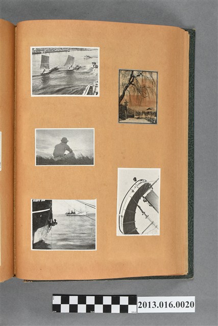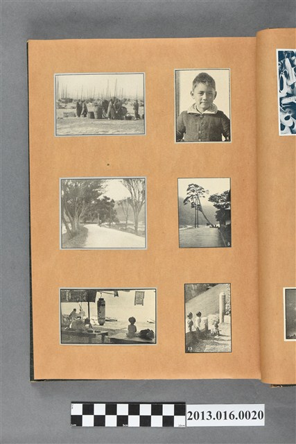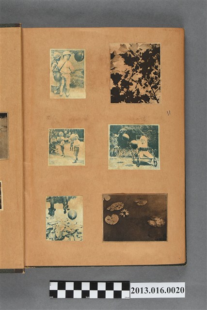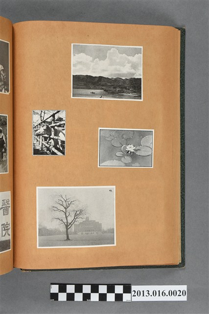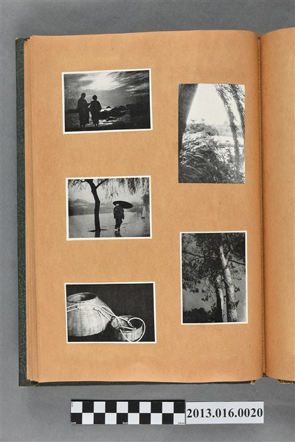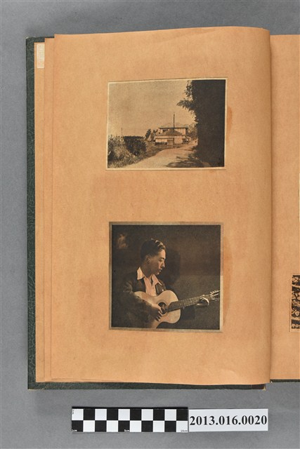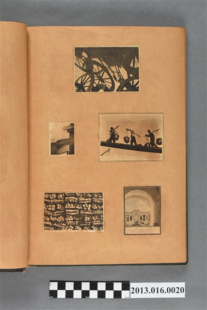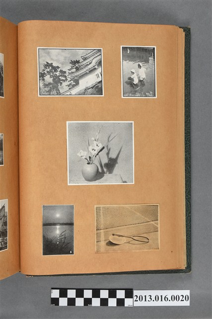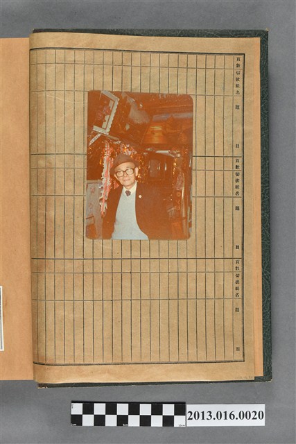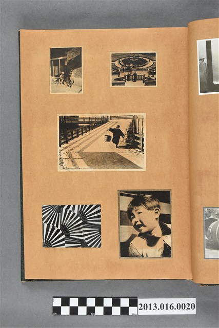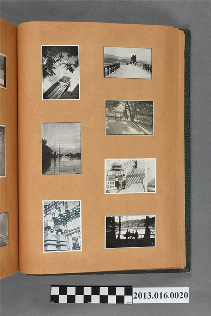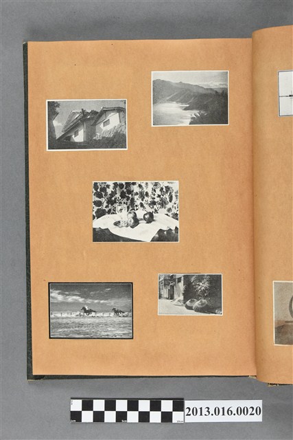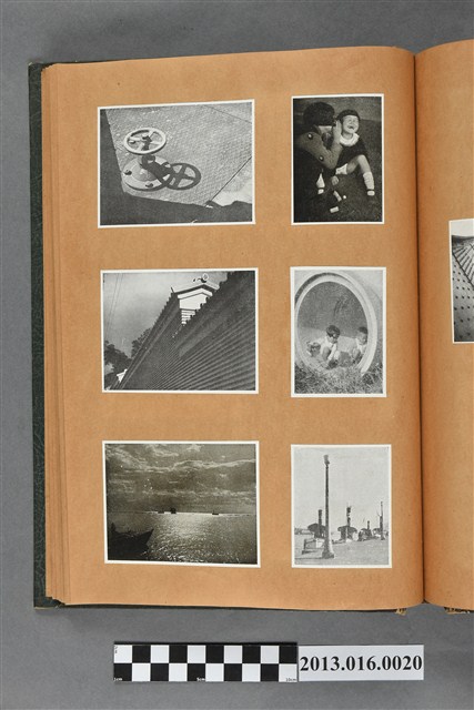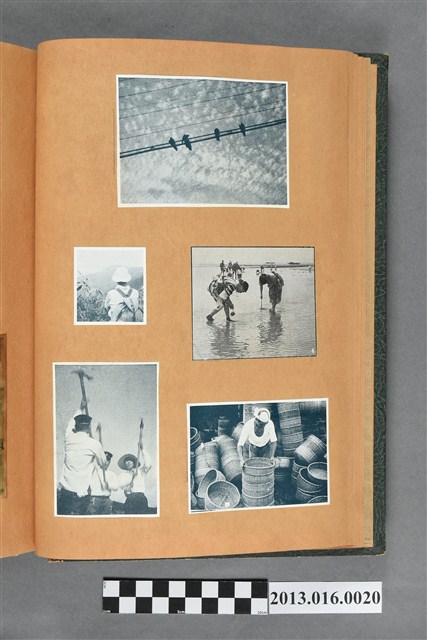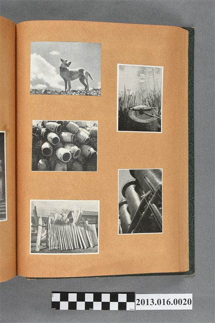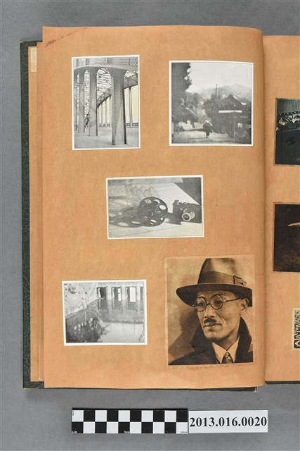 陳崧波文物之藍色書皮剪貼簿,書背燙金印「SCRAP BOOK」字樣。這本剪貼簿所貼內容主要來自出版印刷品。據捐贈者陳義鴻所述,主要是其父陳崧波將早年出版的「陳崧波寫真集」中剪貼而成,影像內容主要是日本時代至戰後初期陳崧波累積的攝影作品,其內容與物件編號「101082-0006」等50年代整理的相本有許多重疊,推測陳崧波1950年代確曾將其攝影作品集結發行,後來到1980年左右由於書籍保存不良,而將印刷品的攝影作品部分剪貼成冊,而空白部分則貼上1980年左右的照片或剪報,如一張雷根當選美國總統的剪報便貼在該剪貼簿中。