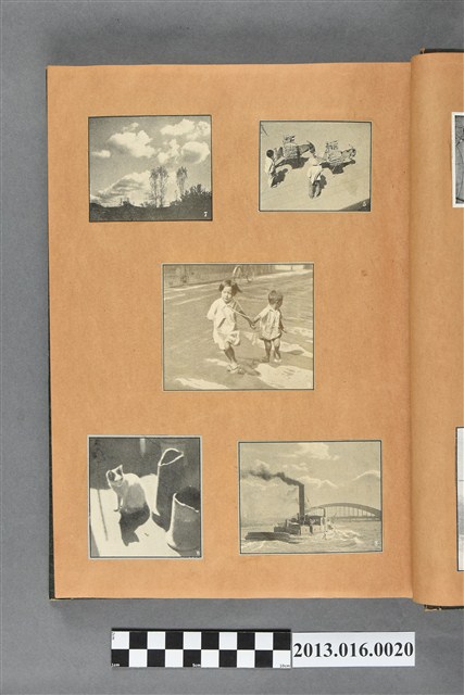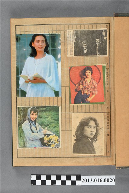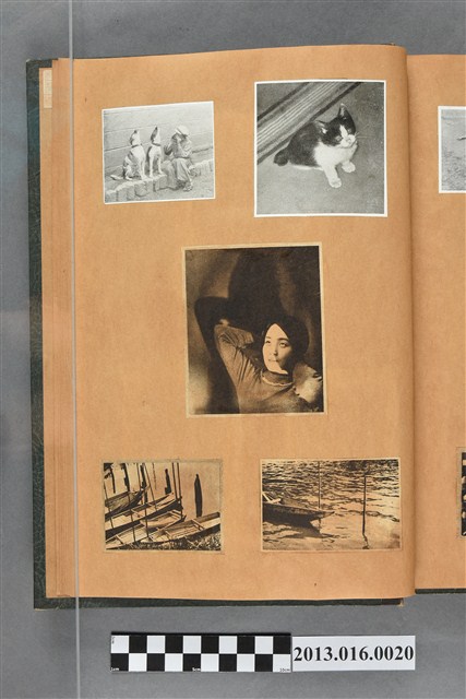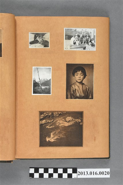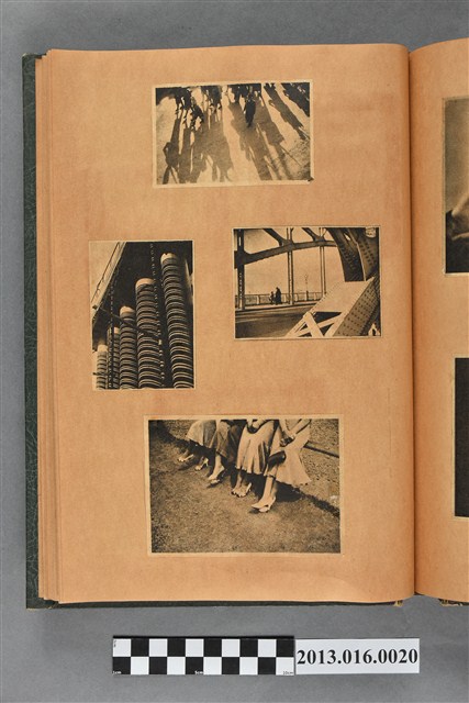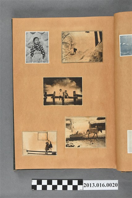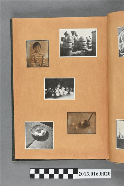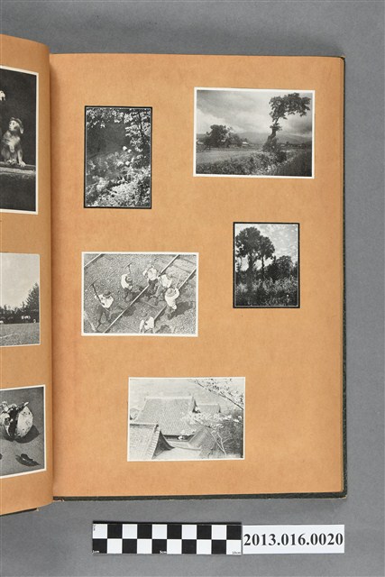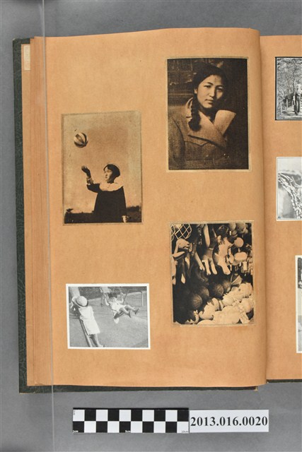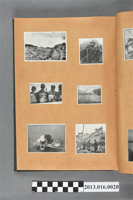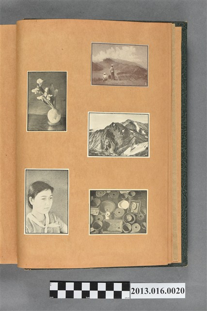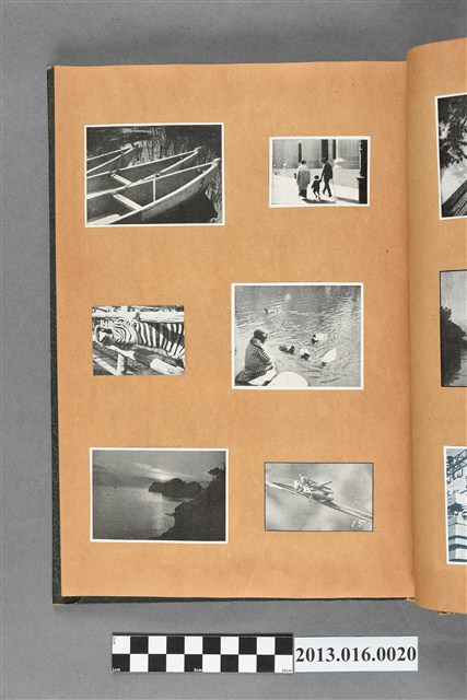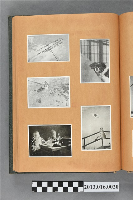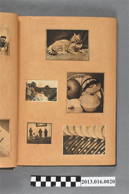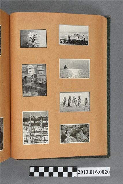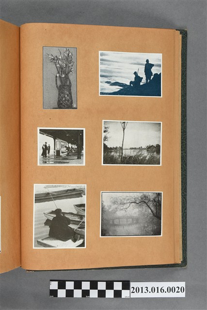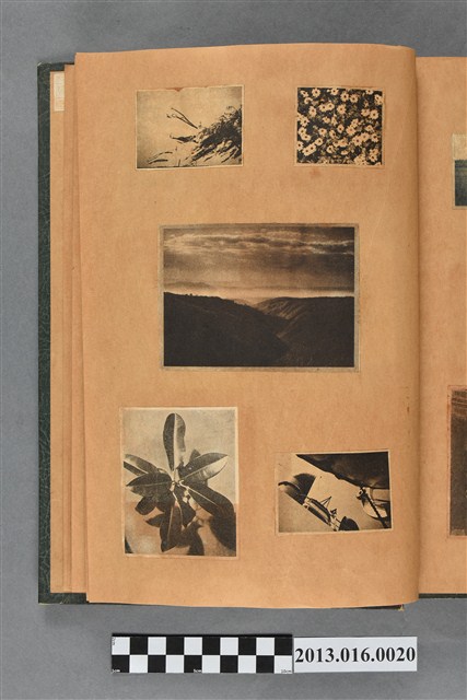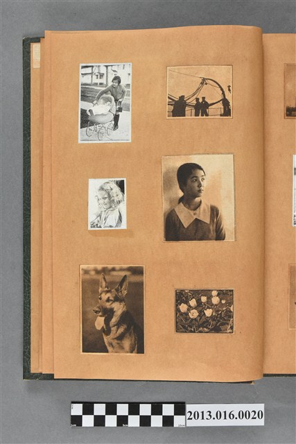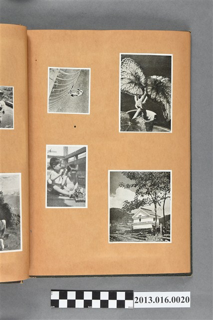陳崧波文物之藍色書皮剪貼簿,書背燙金印「SCRAP BOOK」字樣。這本剪貼簿所貼內容主要來自出版印刷品。據捐贈者陳義鴻所述,主要是其父陳崧波將早年出版的「陳崧波寫真集」中剪貼而成,影像內容主要是日本時代至戰後初期陳崧波累積的攝影作品,其內容與物件編號「101082-0006」等50年代整理的相本有許多重疊,推測陳崧波1950年代確曾將其攝影作品集結發行,後來到1980年左右由於書籍保存不良,而將印刷品的攝影作品部分剪貼成冊,而空白部分則貼上1980年左右的照片或剪報,如一張雷根當選美國總統的剪報便貼在該剪貼簿中。