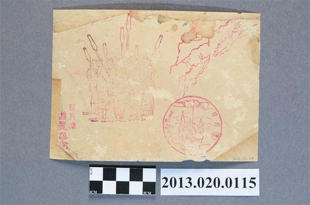 圖為邵族原住民婦女於化蕃ノ由來告示牌前留影,有拿著杵及背著竹籃的,邵族杵歌當時相當有名。