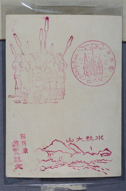 背面有三紀念章。照片中為兩名原住民婦女背著背籃,由服制看來或為泰雅族或賽德克族服飾。