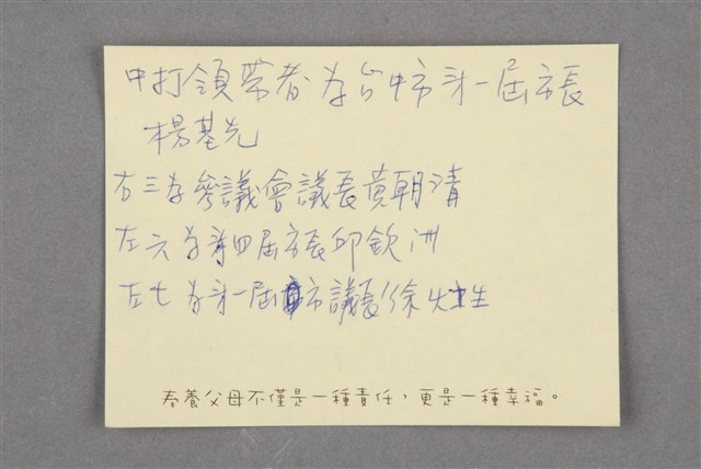 1952年(民國41年),省立臺中商業職業學校主辦商業會計講習會始業紀念。前排中打領帶者為臺中市第一屆市長楊基先、右三為參議會議長黃朝清、左六為第四屆市長邱欽洲、左七為第一屆市議長徐灶生。