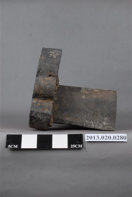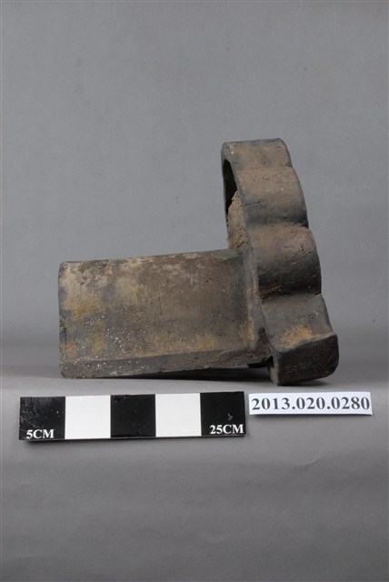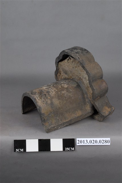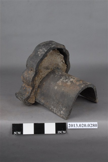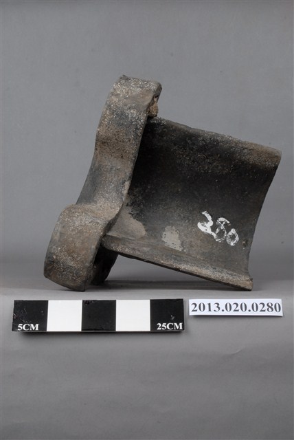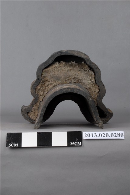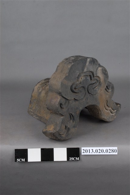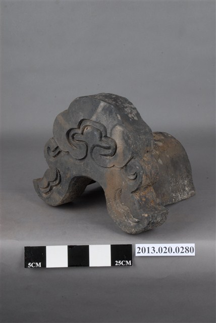 1.本藏品為黑陶鬼瓦,長36.9公分,寬30.5,高29公分,頭部呈現圓弧雲狀,下接微微突起的胴部,胴部下收束成尖角形的兩足。瓦面以銳利深刻的陰刻紋刻畫出松葉與雲形紋,整體給人較為平面的視覺感。2.鬼瓦為日本獸面瓦的統稱,這一類獸面瓦是東亞傳統建築上安裝在屋脊末端的構件,常裝飾以獸面紋,因其形象神似日本傳說中的鬼面,故在日本又有稱為鬼瓦、鬼板等名稱。臺灣因受日本殖民影響,在日治時期有許多建築採用日本瓦作,因此留存相當多的鬼瓦等日式裝飾瓦,甚至有本地陶瓷業者燒製這類瓦片。