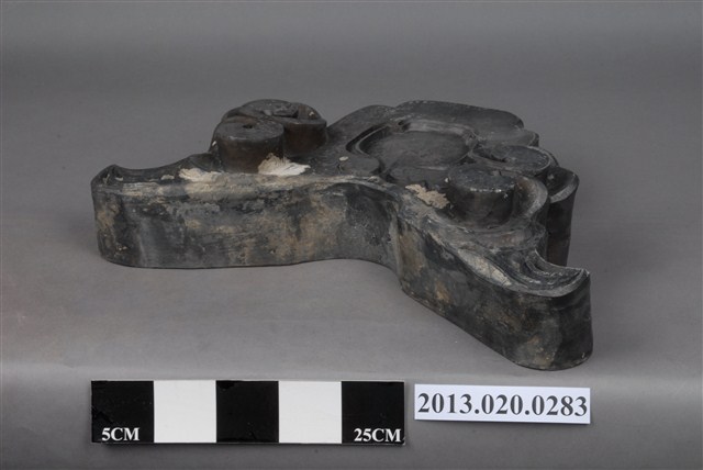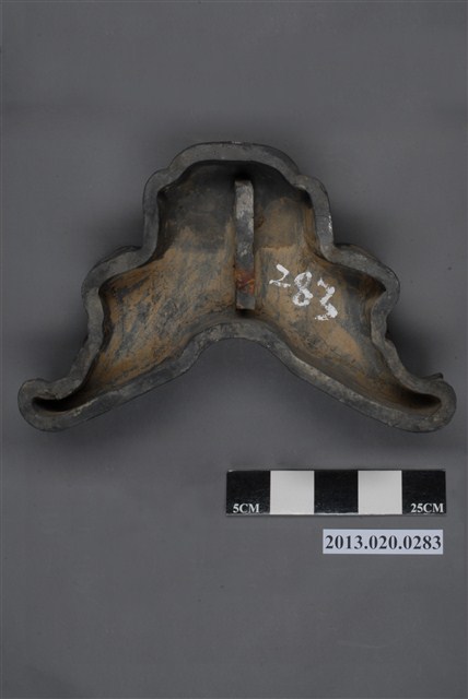 1.本藏品為黑陶鬼瓦,長45.4公分,寬10.6公分,高30公分,頭部呈現圓弧的雲形,側邊平直無覆輪。胴部做S形回卷雲紋,側邊突出兩個角狀分叉下足。頭部中央為陰刻簡化葉紋,胴部S形回卷雲紋則為立體塑成,兩足則則簡單凹紋。整體給人中間簡化,兩側立體之感。2.鬼瓦為日本獸面瓦的統稱,這一類獸面瓦是東亞傳統建築上安裝在屋脊末端的構件,常裝飾以獸面紋,因其形象神似日本傳說中的鬼面,故在日本又有稱為鬼瓦、鬼板等名稱。臺灣因受日本殖民影響,在日治時期有許多建築採用日本瓦作,因此留存相當多的鬼瓦等日式裝飾瓦,甚至有本地陶瓷業者燒製這類瓦片。