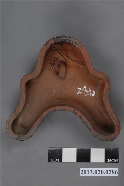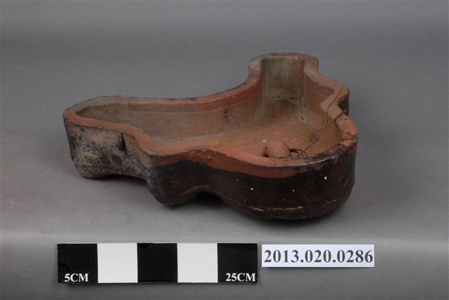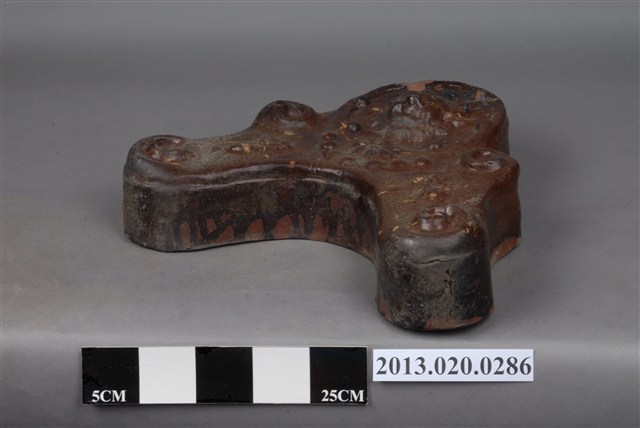 1.本藏品為褐釉鬼瓦,長38.5公分,寬9.8公分,高35.1公分,頭部呈現圓形,胴部為立體回捲雲紋,向外斜下有兩足。頭部中央為獸面紋,下方則有簡化花朵與連珠紋,兩足亦有簡化花朵紋,末端為回捲雲紋。紋飾皆以立體塑成,胎體為紅瓦,瓦面施以褐色釉,背面不施釉。整體給人樸實簡單之感。2.一般鬼瓦為還原燒之黑瓦,本件則為褐釉陶瓷,為日治時期臺灣南投窯燒製之陶器。3.鬼瓦為日本獸面瓦的統稱,這一類獸面瓦是東亞傳統建築上安裝在屋脊末端的構件,常裝飾以獸面紋,因其形象神似日本傳說中的鬼面,故在日本又有稱為鬼瓦、鬼板等名稱。臺灣因受日本殖民影響,在日治時期有許多建築採用日本瓦作,因此留存相當多的鬼瓦等日式裝飾瓦,甚至有本地陶瓷業者燒製這類瓦片。