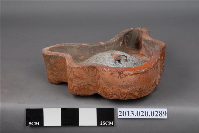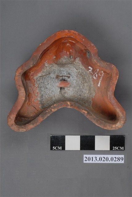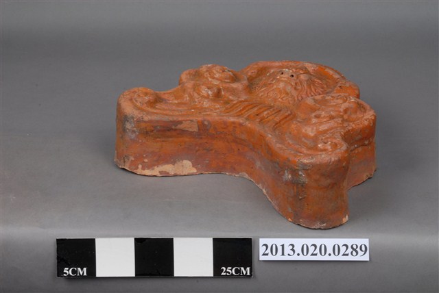 1.本藏品為紅褐釉鬼瓦,長35.4公分,寬10.9公分,高29.8公分,頭部呈現圓弧雲狀,胴部為立體回捲雲紋,向外斜下有兩足。頭部中央為獸面紋,獸面下鬚毛下垂至底部,兩足末端為回捲雲紋。紋飾皆以立體塑成,胎體為紅瓦,瓦面施以紅褐色釉,背面不施釉。整體給人樸實簡單之感。2.一般鬼瓦為還原燒之黑瓦,本件則為紅褐色釉陶瓷,為日治時期臺灣南投窯燒製之陶器。3.鬼瓦為日本獸面瓦的統稱,這一類獸面瓦是東亞傳統建築上安裝在屋脊末端的構件,常裝飾以獸面紋,因其形象神似日本傳說中的鬼面,故在日本又有稱為鬼瓦、鬼板等名稱。臺灣因受日本殖民影響,在日治時期有許多建築採用日本瓦作,因此留存相當多的鬼瓦等日式裝飾瓦,甚至有本地陶瓷業者燒製這類瓦片。