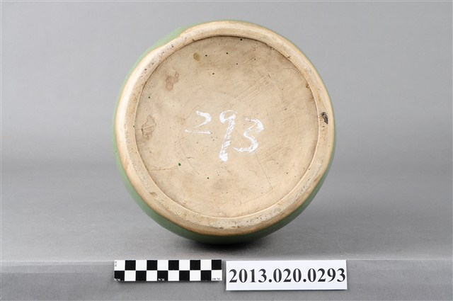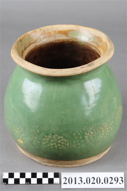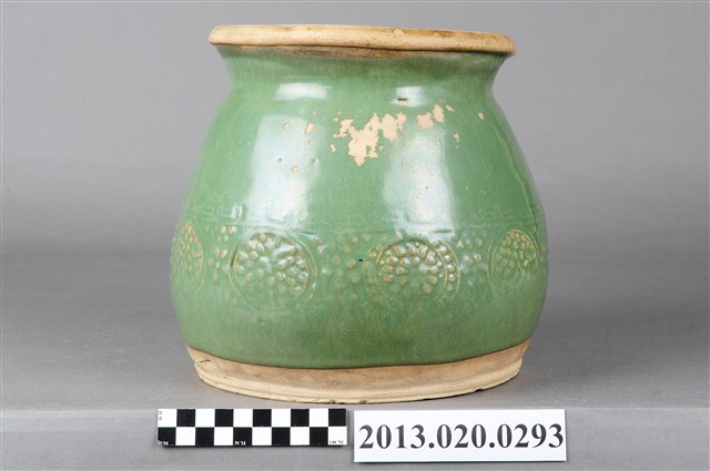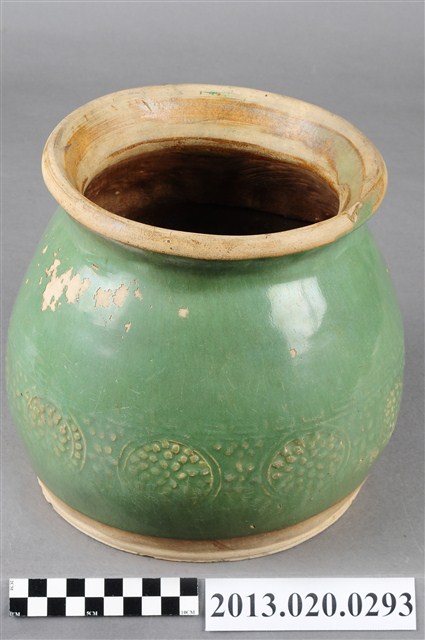 廣口,束頸,弧腹,器物重心在器腹下半部。器身拉坯成形,平底微凹係外接貼附。約器身三分之二處,環繞器身一週裝飾回紋與圓形開光點花紋印花裝飾帶。外器壁自頸部至近底處施罩不透明銅綠釉,部分剝釉。內器壁無釉,外底亦無釉。同類型製品可見於1822年末開往印尼的中國籍得順號沉船出水遺物,目前已知是廣東石灣窯製品。其原始功能應為儲存或加工容器,在臺灣民間經常稱為「荷蘭甕」或「汕頭糖罐」,在排灣族原住民部落則可見作為傳家寶。
