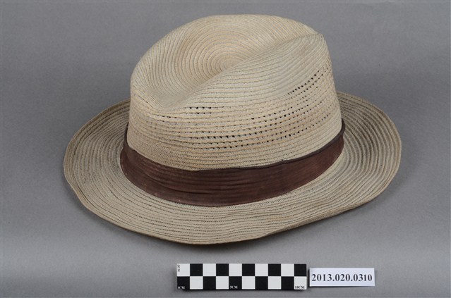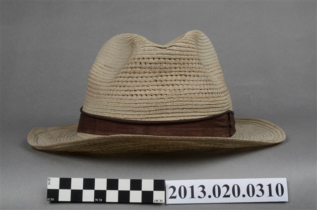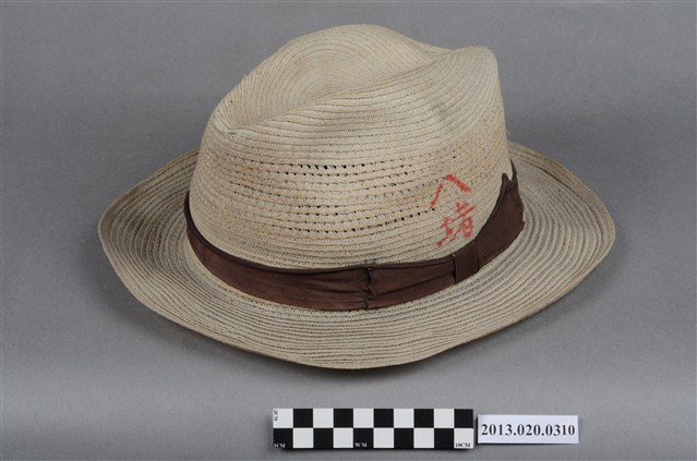 本件為塑膠細繩所編織的涼帽,為典型的紳士帽型,搭配咖啡色織帶裝飾,帽子頂部為前尖後圓的水滴凹陷,方便穿脫拿取,帽簷平坦寬闊,配戴時透氣涼爽,遮陽效果佳。帽前有用紅墨印有八堵兩字,推測可能為贈品或是某機關的員工制服配件。