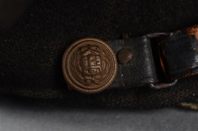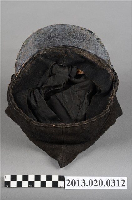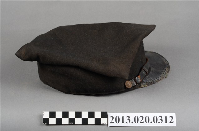本件為日本明治大學生帽,材質推測為羅紗(ラシャ,毛料),發行時間不詳。帽面為黑色,帽沿則是黑色,材質推測為皮革材質,整體形制為圓帽(日語:丸帽),帽沿上方別有徽章(「大學」字樣),帽沿另有金屬鈕扣(上有「大學」字樣),扣住皮革繩帶。明治大學,位於東京都千代田區神田駿河台,為日本一所私立大學,創立於1881年,初名「明治法律學校」,1920年改制成為大學,設有法、商、政治、文等四個學院。