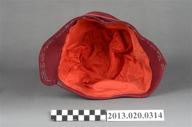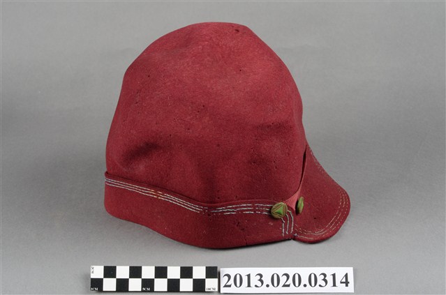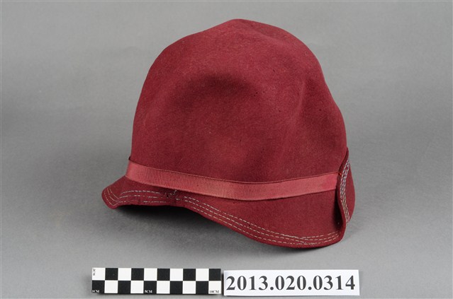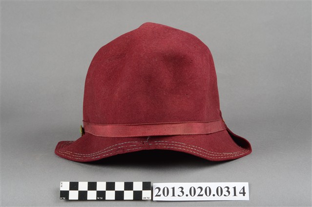 1.此帽為淺紅色摩登淑女帽,鐘形帽型,淺紅色毛呢材質,搭配同色絲帶及兩粒金色造型帽釘作為裝飾,帽內有紅色透氣薄布料作為內襯,應為日治時期社經地位較高的女性流行帽飾。2.鐘形帽是一種像鐘形的女帽,1920年代至1933年流行於美國。由法國設計師CarolineReboux在1908年發明。其名稱來自法語單詞「Cloche」,意為「鐘」。通常是毛呢材質,較硬挺的。3.江戶時代後,日本逐漸西化,歐美的帽子在日治時期引入臺灣。