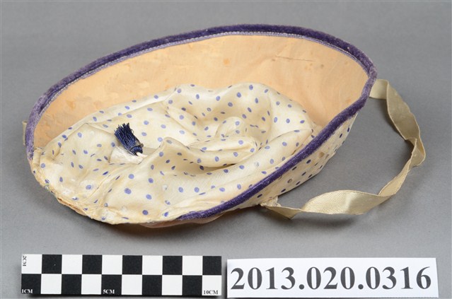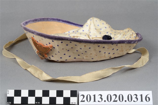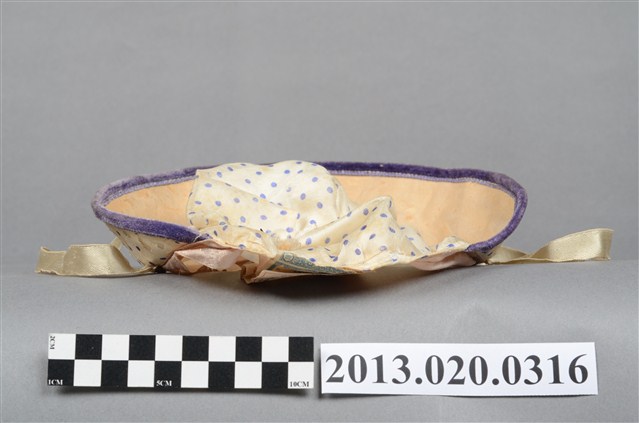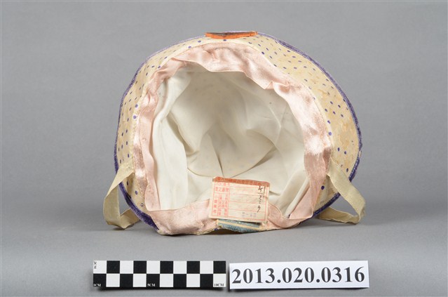 1.本帽為兒童帽,海軍水手帽型,白底紫色波點布料製作,帽簷滾紫邊並且全部上翻,帽頂跟帽檐齊高,有鷹形的帽徽,帽頂中央有一深藍色流蘇裝飾,內襯為白色透氣薄布,有白色繫帶可固定於兒童下頜,汗圈位置有貼有一「臺北纖維品查定委員會三」方型標籤,內標明種類番號及價格等資訊。2.江戶時代後,日本逐漸西化,歐美的帽子在日治時期引入臺灣。在二十世紀初期,擁有帽子的能力在文化上被認為是財富的標誌,也因為夠時尚而被認為是「身份的象徵」。