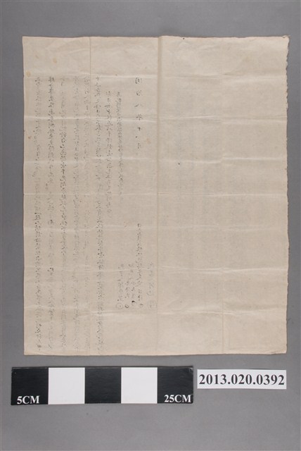 本件文物為立契人陳日昇將自身與傅亀同墾之魚塭售出之立賣杜絕盡根契。魚塭位於軍工廠北(今臺南市小北一帶)。立契時間為清同治八年十一月。契約為中人為郭應望,知見人妻傅氏及子大漢,代書人為何記。