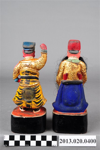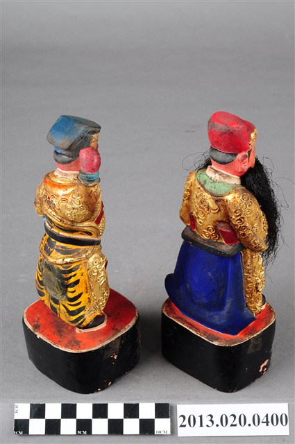 文判及武判,為司法行政及地方守護神常見之陪祀神,多配祀於土地公、城隍爺之側,司查受審人之功過。本件木雕文武判神像採立式,分作文官及武將造型,表面作金色漆線雕裝飾。