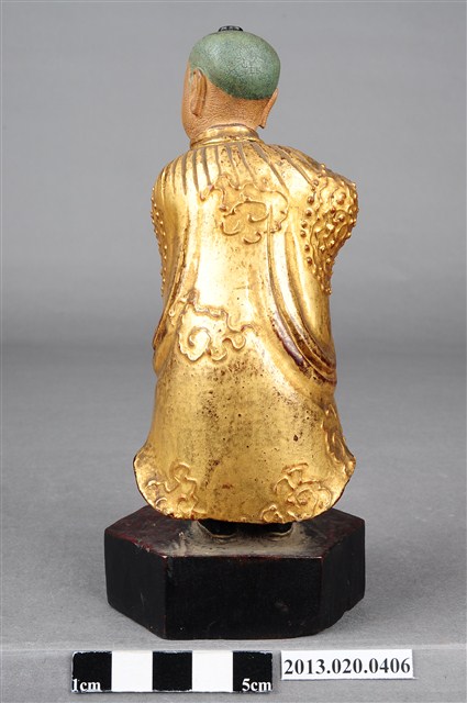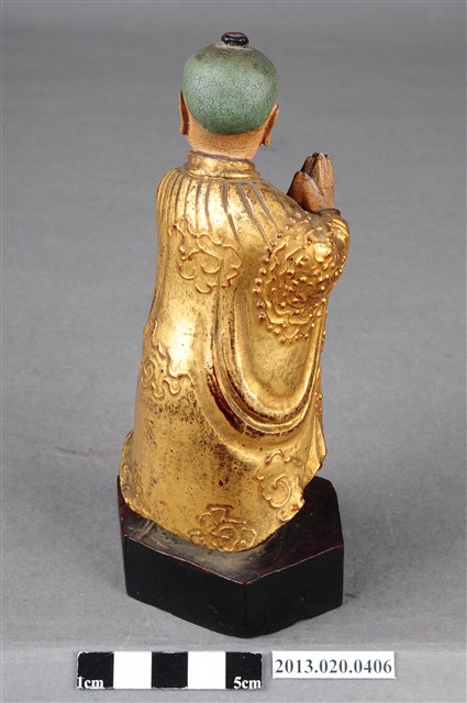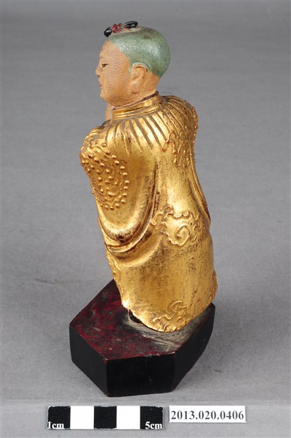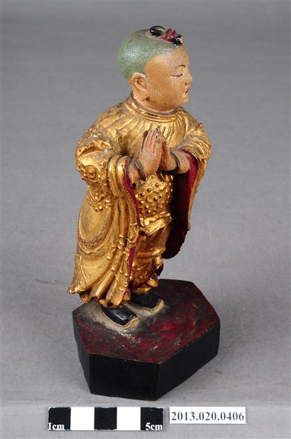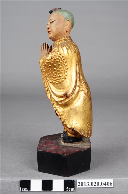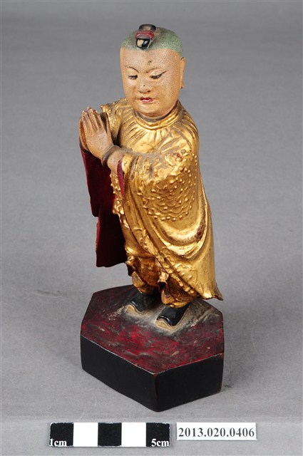 善才童子為觀音菩薩身旁的陪祀神,其常與「良女」一左一右立側於觀音像旁,為通俗化觀音造像常見之群像組合。本件善才童子造像雙手合掌於右,取朝拜觀音之勢,身著長袍,頭部留童子單髻髮飾,突顯其童稚之身分。像表面以金底漆線雕手法裝飾。