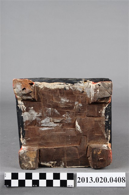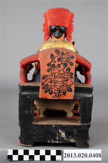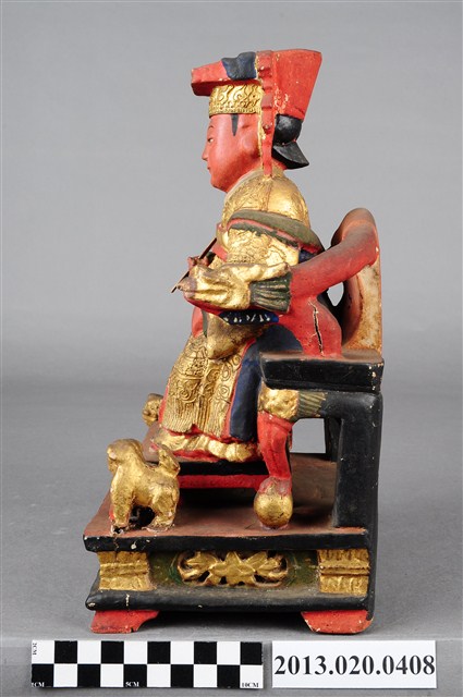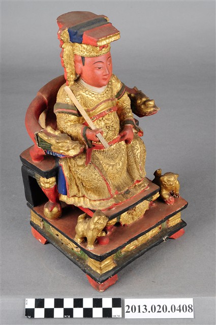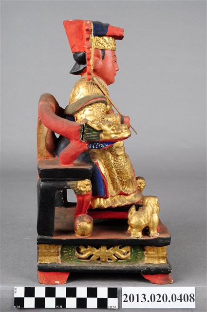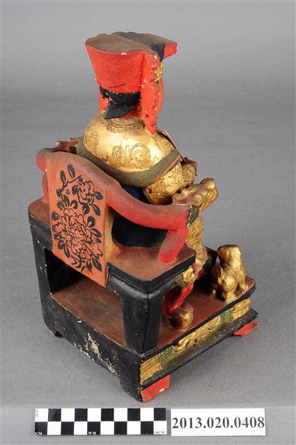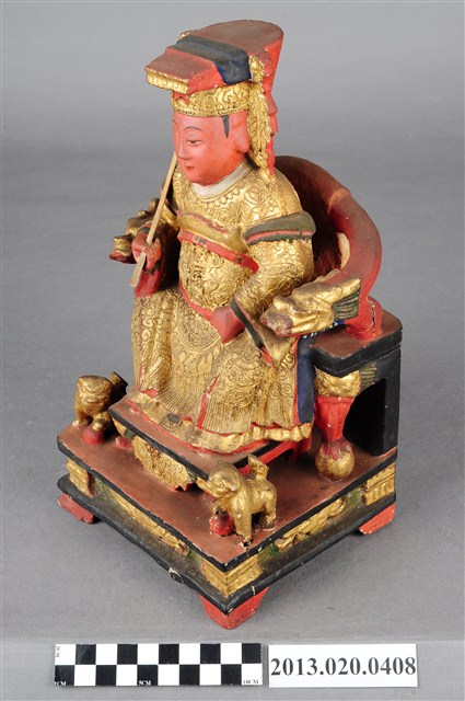 本件木刻媽祖神像採坐式,基座為兩層抬昇,左右各帶一頭小獅;媽祖神像手持奏版,一手結印於腰間,戴鳳冠披霞綾。神像表面以金底漆線雕手法裝飾。