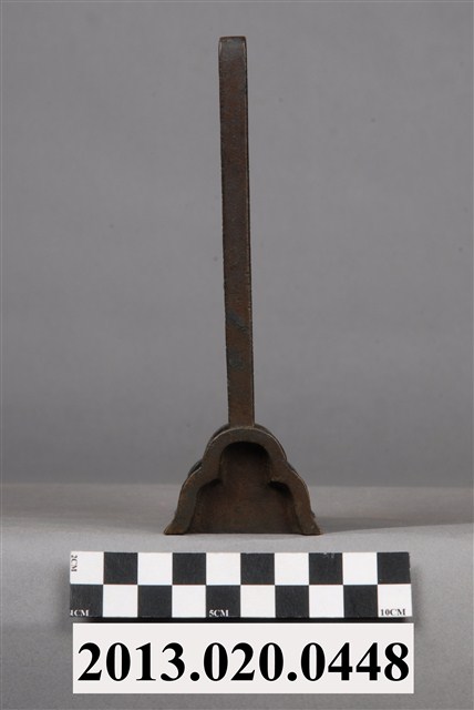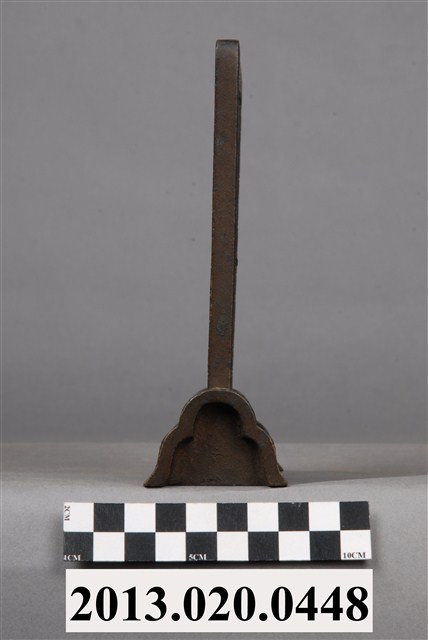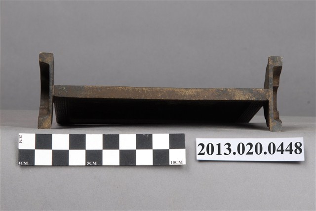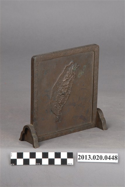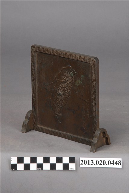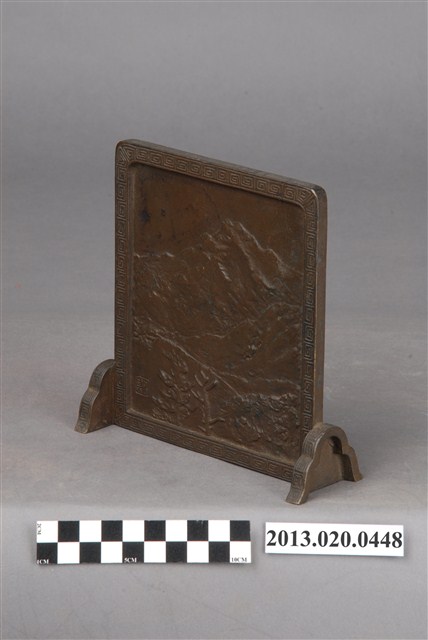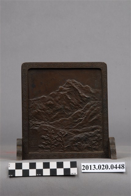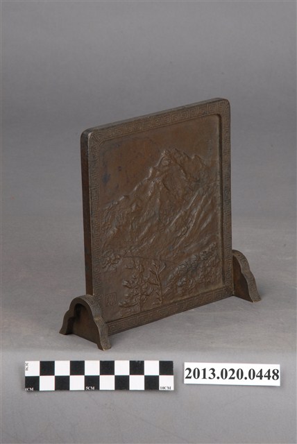 本件文物為金屬製(銅製)仿屏風扇版的小型藝品,屏面作遠眺近山的景致,四周用連續回紋作邊飾。