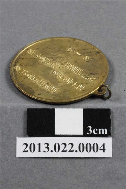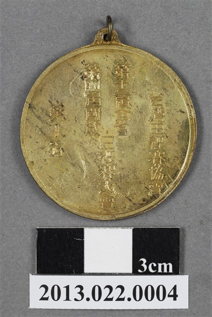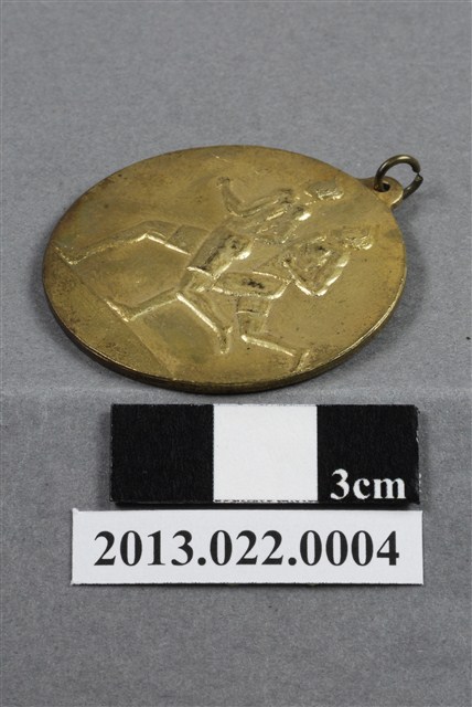 1.臺灣田徑賽協會第12屆全省暨第4屆國教田徑賽大會第1名獎牌為壓鑄法製成,呈薄圓形,雙面,上方有一凸耳,中有一孔,穿細環,獎牌以浮雕、陽刻技法為主。獎牌正反面皆有多處磨損和刮痕,獎牌正面凸起處有較深的磨損痕跡;背面多有鍍金時產生的不平整紋路,右下邊緣則有較大範圍的髒污。獎牌正面底陰刻一線,暗示水平地面或是田徑賽場的跑道。其上浮雕兩名男性跑者,小平頭,上身赤裸,下著緊身短褲,體格精實,肌肉紋理刻畫寫實,如手臂、腿部奮起、繃緊的肌肉線條。兩名跑者一前一後,大步邁出左、右腳,刻畫上以透視法呈現兩者與觀者的遠近關係。獎牌背面周圍作環狀浮雕紋飾,中央陽刻筆畫纖細的文字,由右至左書:「台灣田徑賽協會」、「第十二屆全省/第四屆國教.田徑賽大會」、「第1名」。其中數字一以陰刻粗體呈現,別有強調之意。2.臺灣田徑賽協會為臺灣光復後,高何土於1948年成立,張星賢為第一任會長。成立後旋即舉辦臺灣省田徑賽,一共主辦五十屆左右,1998年因凍省而停止舉辦。本件作品為第12屆田徑大賽,係為1960年舉辦之賽事獎牌。第12屆田徑大賽亦同時為第4屆國民教育田徑大賽,國民教育簡稱「國教」。獎牌為大量製造之產品,壓鑄法的模具可重複使用,製作過程快,且厚度、尺寸掌握度高。