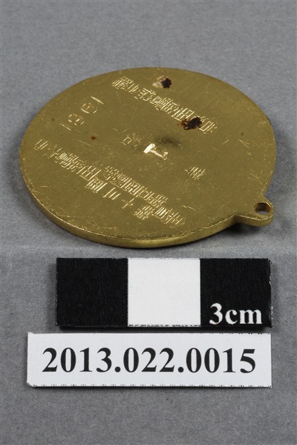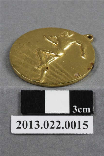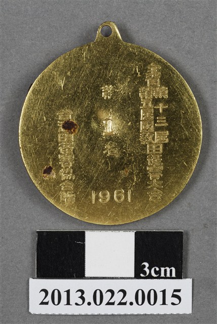 1. 臺灣田徑賽協會第13屆全省暨第5屆國教田徑賽大會第1名獎牌為壓鑄法製成,呈薄圓形,雙面,上方有一凸耳,中有一孔,獎牌以浮雕、陽刻技法為主。獎牌正反面皆有多處磨損和刮痕,獎牌正面右側邊緣有明顯鏽蝕痕跡與大片髒污;背面有些許鍍金時產生的不平整紋路,左下方則有兩處明顯的鏽蝕痕跡,遮蔽部分陽刻文字。獎牌正面陰刻五條斜線,由近而遠地表現出田徑賽場的跑道。跑道上浮雕一名男性跑者,小平頭,上身著寬肩帶背心,下著緊身短褲,體格精實,肌肉紋理刻畫寫實,如手臂、腿部奮起、繃緊的肌肉線條。跑者抬起左膝,右腳僅腳尖著地,身體呈斜線,刻畫出全力奔跑的姿態,頗富張力。獎牌背面僅中央陽刻筆畫纖細的文字,由右至左、上至下書:「第十三屆全省/第五屆國教.田徑賽大會」、「第1名」、「1961」、「台灣田徑賽協會贈」。其中「第1名」的數字一以陰刻粗體呈現,別有強調之意。2. 臺灣田徑賽協會為臺灣光復後,高何土於1948年成立,張星賢為第一任會長。成立後旋即舉辦臺灣省田徑賽,一共主辦50屆左右,1998年因凍省而停止舉辦。本件作品為第13屆田徑大賽,係為1961年舉辦之賽事獎牌。第13屆田徑大賽亦同時為第六屆國民教育田徑大賽,國民教育簡稱「國教」。獎牌為大量製造之產品,壓鑄法的模具可重複使用,製作過程快,且厚度、尺寸掌握度高。