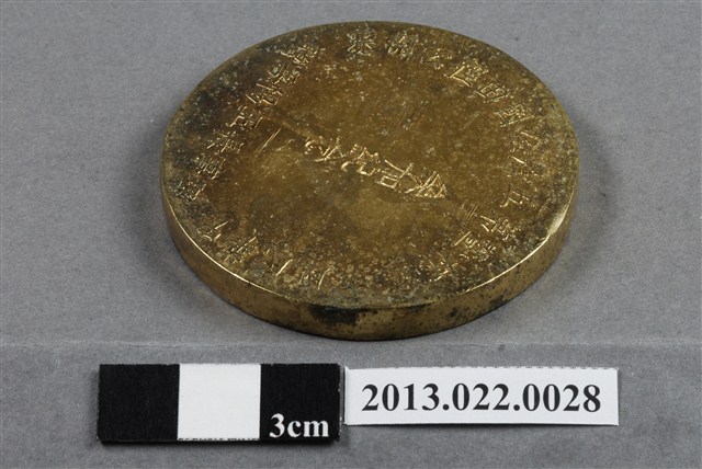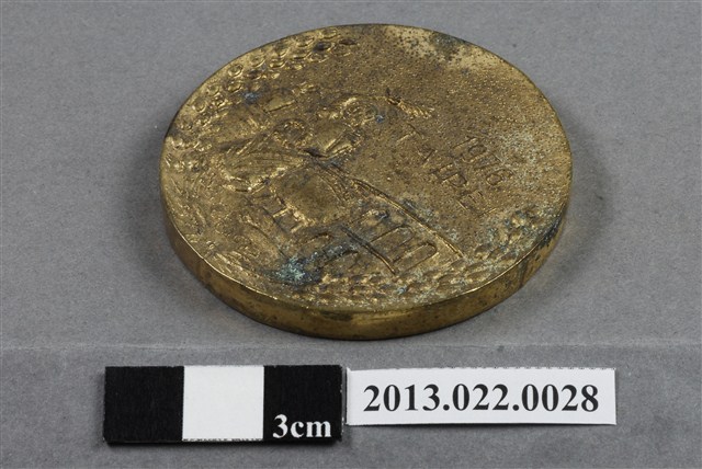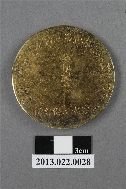 1. 中華民國中正杯暨第五屆全國田徑公開賽參加紀念獎牌為壓鑄法製成,呈扁平的圓形,雙面,厚度較厚。獎牌以浮雕、陽刻技法為主。獎牌正反兩面都有較多磨損、刮痕以及鏽蝕痕跡,並有幾處的金屬表面變色,獎牌表面亦有鍍金時留下的凹凸不平。獎牌正面下方飾以交叉的兩股稻穗,烘托出中央的圖案:手握月桂冠與稻穗、身著短袖長袍的人物,站在競技場建築物與聖火火盃旁。右上方則有數字「1976」與英文字「TAIPEI」。獎牌背面陽刻筆劃細緻的文字,由上至下、右至左書寫:「中華民國中正杯暨第五屆全國田徑公開賽」、「參加紀念」與「理事長王惕吾贈」。2. 中華民國田徑協會最早於民國44年成立,原名為「中華民國田徑委員會」,第一屆中華民國全國田徑公開賽於民國61年,即1972年開始每年舉辦,直至第五屆舉辦時即為獎牌上所註明的1976年。民國62年中華民國田徑協會改組成立,王惕吾擔任第一屆理事長。中華民國田徑協會自成立以來舉辦多項田徑賽事,並帶領中華民國選手遠赴世界各地參賽,時至今日仍持續推廣田徑運動,定期舉辦賽事。金屬制獎牌為大量製造之產品,壓鑄法的模具可重複使用,製作過程快,且厚度、尺寸掌握度高。