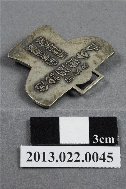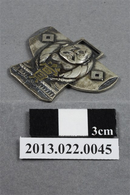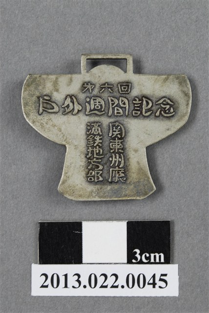 1. 滿鐵地方部第六回戶外週間紀念獎牌為壓鑄法製成,呈扁平的多邊形,雙面,獎牌上方鑲有一長方形孔洞,應可作為穿繩吊掛之用。獎牌以浮雕、陽刻技法為主。獎牌正反面皆有多處磨損和刮痕,且有些許髒污以及金屬變色現象。獎牌正面浮雕圖案,圖案並不局限於底座多邊形的範圍內,增添了獎牌整體構圖的活潑度與變化。浮雕圖案為一名男子,濃眉大眼,臉上蓄鬍,上身赤裸,下著寬鬆、繁複的長袍。男子雙手捧著一「賞」字,且「賞」字鍍上不同顏色,於畫面中跳脫出來。獎牌背面陽刻筆劃上帶有明顯粗細變化的文字,上至下、左至右書寫:「第六回」、「戶外週間紀念」、「滿鐵地方部」、「關東州廳」。2. 本件作品由張昭平先生捐贈張星賢先生的體育文物,而本件作品對張星賢先生有密切的關聯和回憶。張星賢承蒙楊肇嘉先生贊助、並從早稻田大學畢業之後,於1934年考取了南滿洲鐵道株式會社(簡稱滿鐵)的職員。滿鐵對於運動競賽十分重視,舉辦各項運動賽事之外,也常和日本各大學往來、舉辦對抗賽。金屬制獎牌為大量製造之產品,壓鑄法的模具可重複使用,製作過程快,且厚度、尺寸掌握度高。