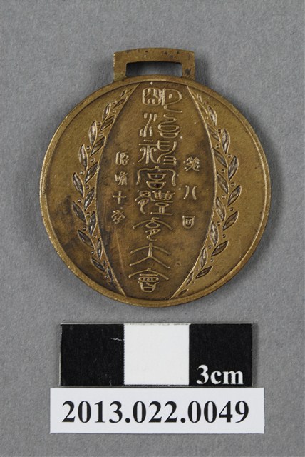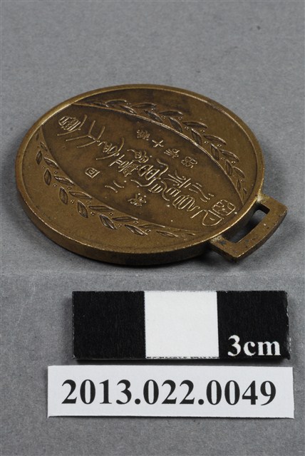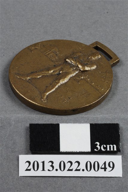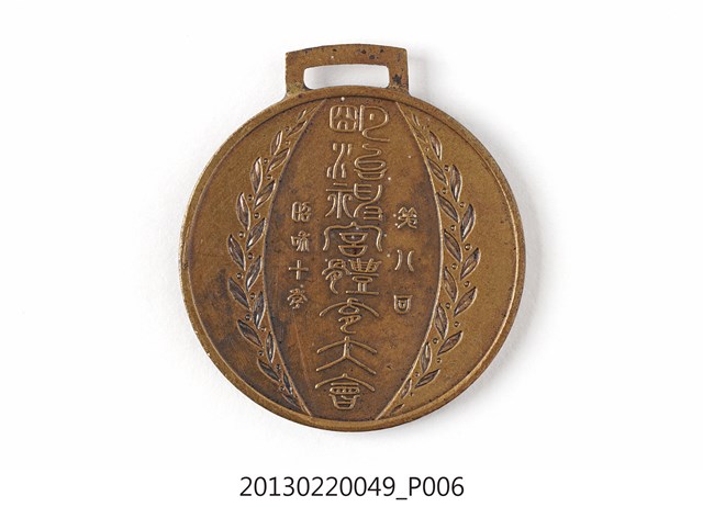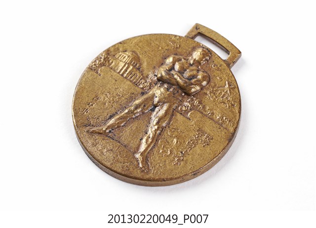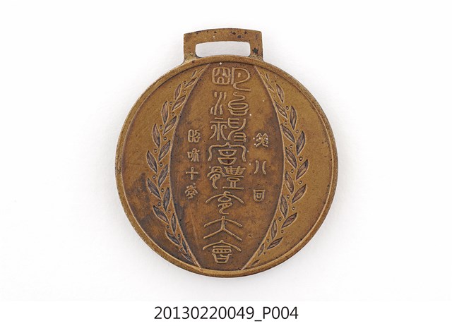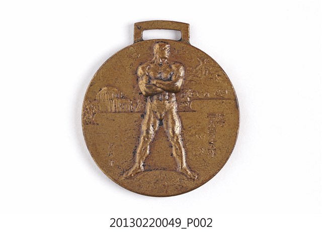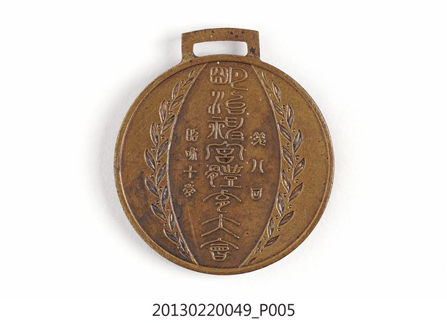 1.本物件為昭和10年(1935)明治神宮體育會主辦的明治神宮第8屆體育大會紀念章,金屬材質。紀念章正面有1名男子做雙手交叉於胸前姿態之圖樣,底部有建築物圖樣。右側有紀元二千五百九十五年字樣;背面有「明治神宮體育大會」、「第八回」、「昭和十年」字樣以及葉子圖樣。本物件表面有鏽蝕現象。