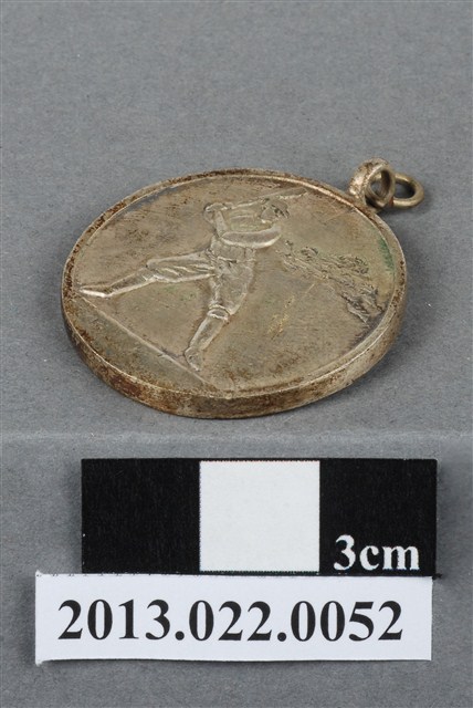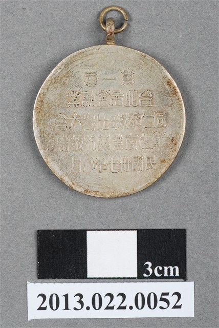 本物件為民國37年第1屆臺北市金融業同仁棒球比賽大會紀念章,金屬材質。紀念章正面有1名做揮棒姿態之男子圖樣,其戴帽,手持球棒;背面有「第一屆」、「臺北市金融業」、「同仁棒球比賽大會」、「彰化商業銀行敬贈」、「民國卅七年八月」字樣。本物件表面有鏽蝕現象。