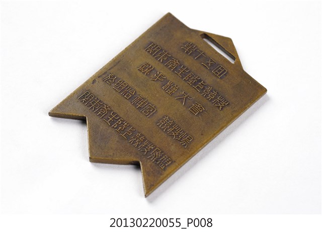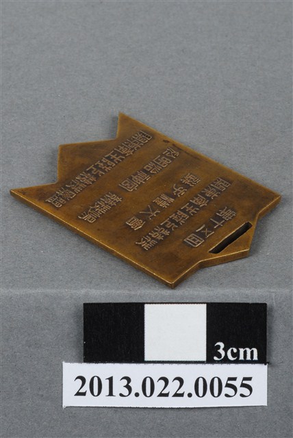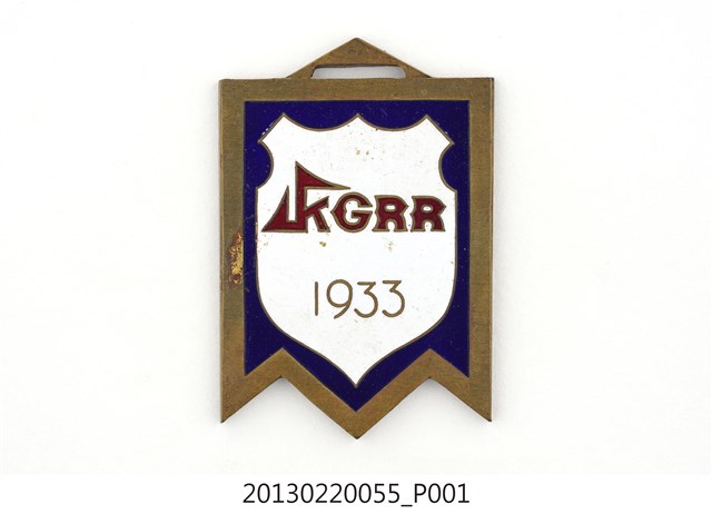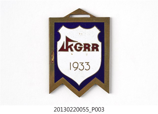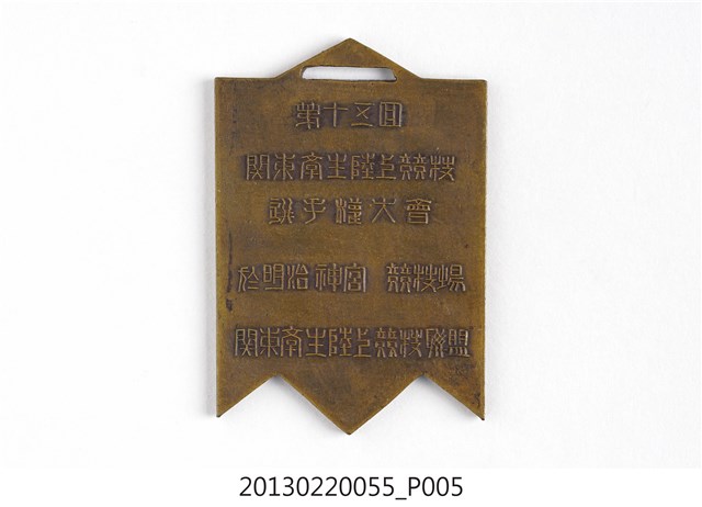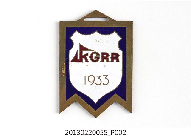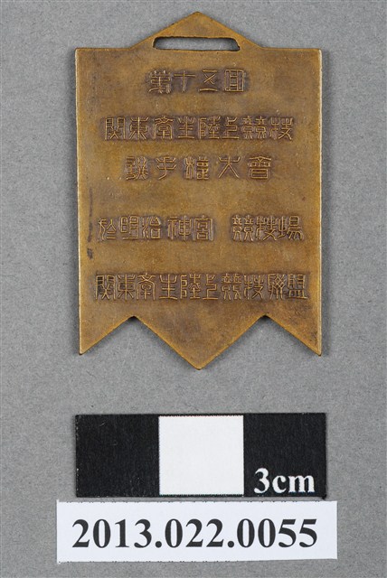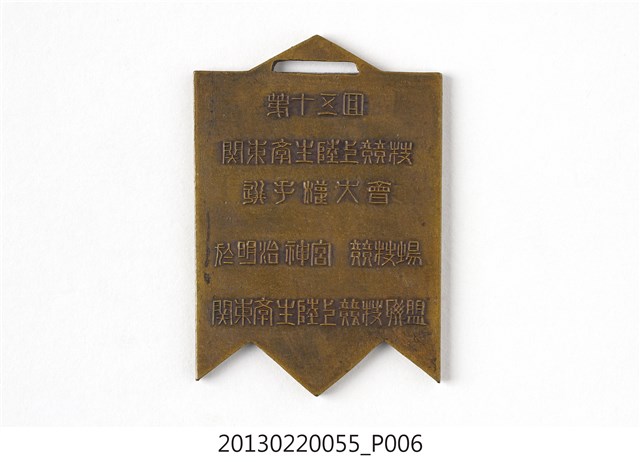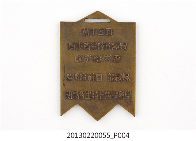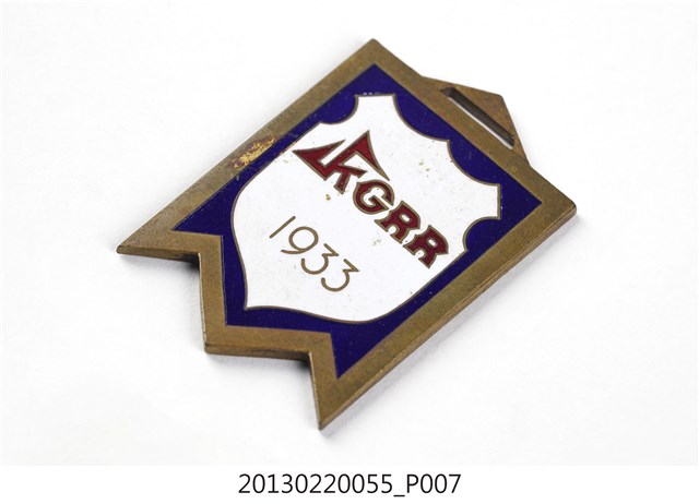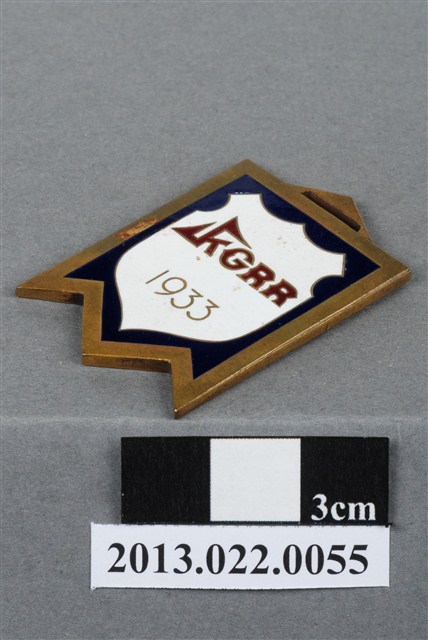 1.本物件為昭和8年(1933)關東學生陸上競技聯盟主辦的第15屆關東學生陸上競技選手權大會紀念章,金屬材質。紀念章正面有1白底圖樣,其圖樣上有「KGRR」字樣,顏色為紅色,並有1933字樣。紀念章外框與白底圖樣之間為藍底。背面有「第十五回」、「關東學生陸上競技」、「選手權大會」、「於明治神宮競技場」、「關東學生陸上競技聯盟」字樣。本物件表面有鏽蝕現象。