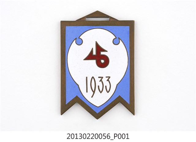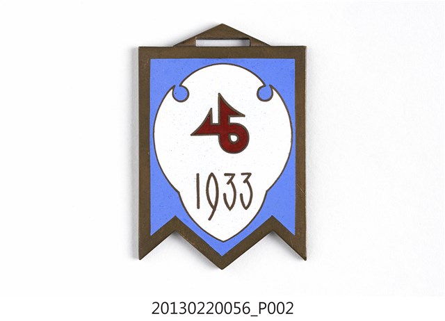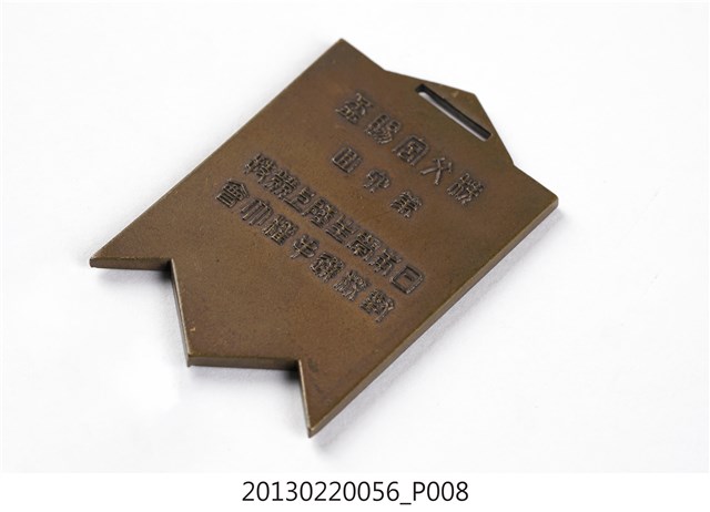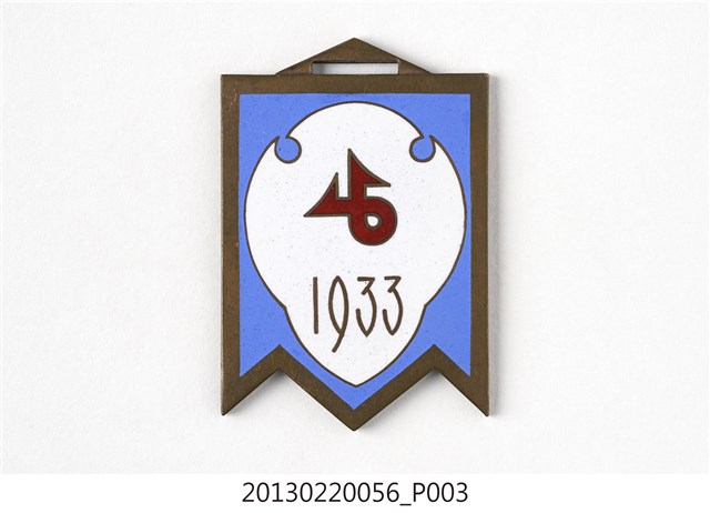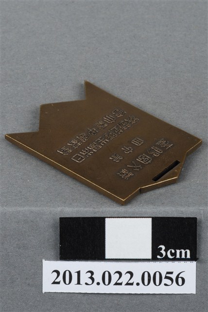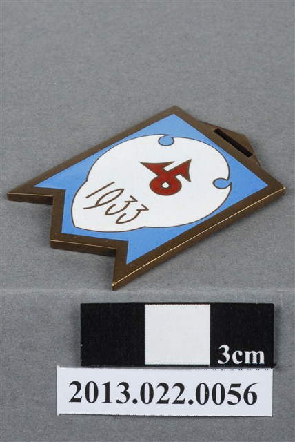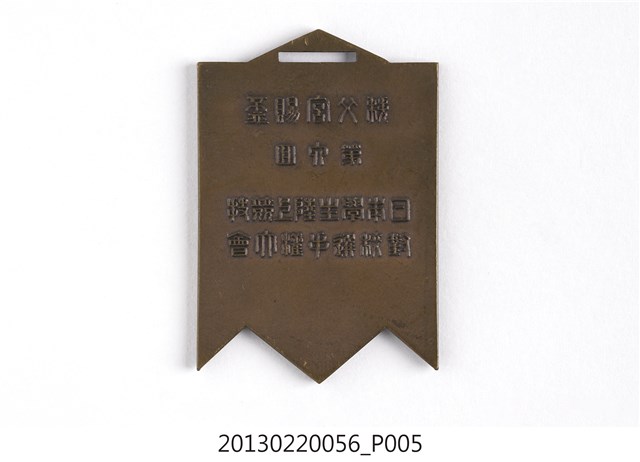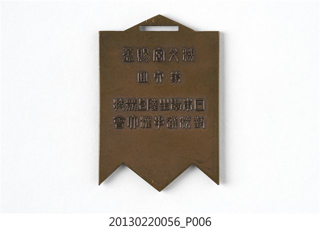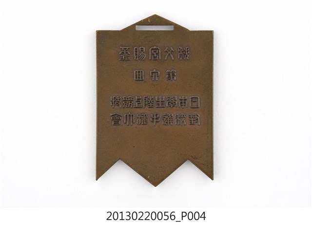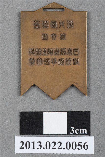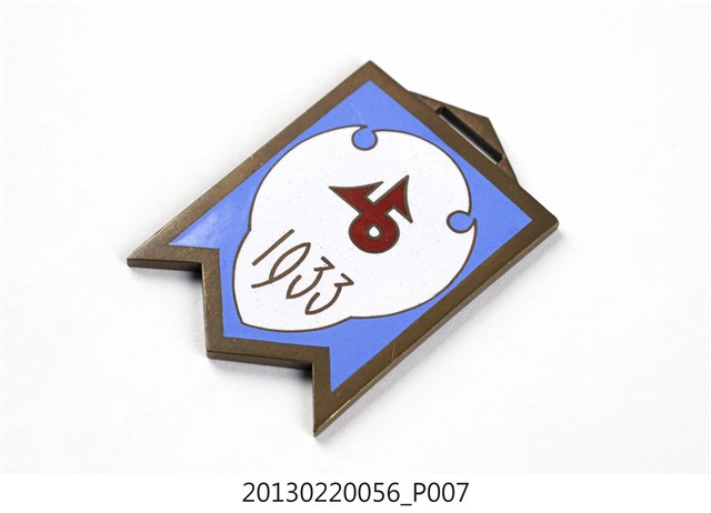1.本物件為昭和8年(1933)秩父宮盃第6屆日本學生陸上競技對校選手權大會紀念章,金屬材質,對校之意應為校際之間競賽,相當於日本的大專盃。紀念章正面有1白底圖樣,其圖樣上有箭頭圖樣,顏色為紅色,並有1933字樣。紀念章外框與白底圖樣之間為藍底。背面有「秩父宮賜盃」、「第六回」、「日本學生陸上競技」、「對校選手權大會」字樣。本物件表面有鏽蝕現象。