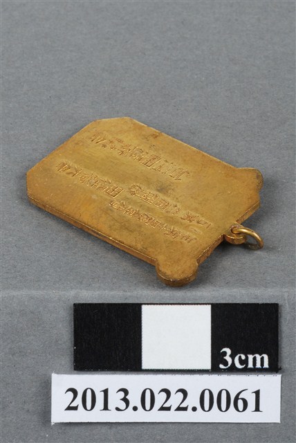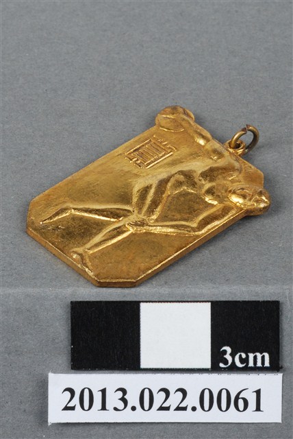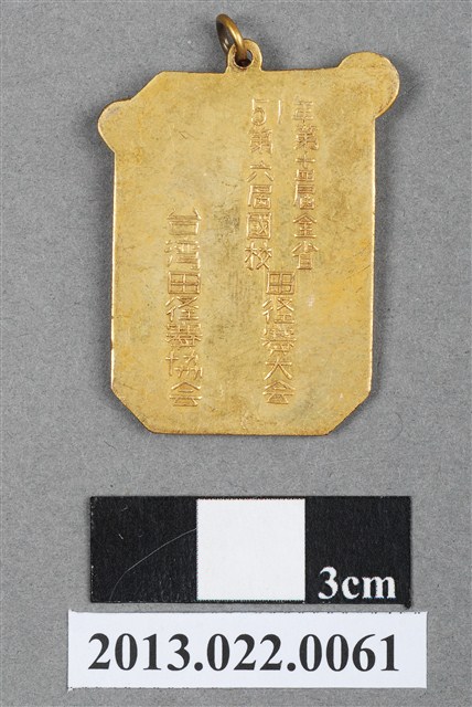 1. 臺灣田徑賽協會第14屆全省暨第6屆國教田徑賽大會獎牌為壓鑄法製成,呈扁平、長八邊形,雙面,上方有一凸起小環,中間穿另一環狀,應為懸掛作用。獎牌以浮雕、陽刻技法為主。獎牌正反面皆有多處磨損和刮痕,並有些許鍍金時產生的不平整紋路。獎牌正面浮雕一人像,以古希臘雕塑作品《擲鐵餅者》為靈感,高浮雕手執鐵餅的人像。人像頭髮鬈曲,深目高鼻,體格健壯厚實,浮雕著重於肌肉紋理的刻畫,但並未仔細處理細節。手臂、小腿的肌肉線條略顯刻畫不足,且關節連結處顯得較為生硬。人像突出於牌面的八邊形,使得構圖較為活潑特殊。獎牌正面陽刻一大「賞」字;背面則陽刻筆畫纖細的文字,由右至左、上至下書:「51年」、「第十四屆全省/第六屆國教.田徑賽大會」、「台灣田徑賽協會」。2. 臺灣田徑賽協會為臺灣光復後,高何土於1948年成立,張星賢為第一任會長。成立後旋即舉辦臺灣省田徑賽,一共主辦50屆左右,1998年因凍省而停止舉辦。本件作品為第十四屆田徑大賽,係為1962年舉辦之賽事獎牌。第十四屆田徑大賽亦同時為第六屆國民教育田徑大賽,國民教育簡稱「國教」。獎牌為大量製造之產品,壓鑄法的模具可重複使用,製作過程快,且厚度、尺寸掌握度高。