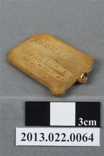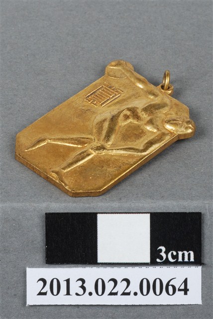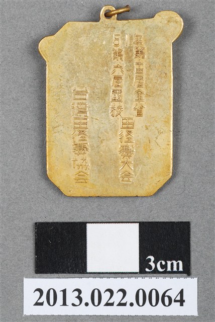 1. 臺灣田徑賽協會第14屆全省暨第6屆國教田徑賽大會獎牌為壓鑄法製成,呈扁平、長八邊形,雙面,上方有一凸起小環,中間穿另一環狀,應為懸掛作用。獎牌以浮雕、陽刻技法為主。獎牌正反面皆有多處磨損和刮痕,並有些許鍍金時產生的不平整紋路。獎牌正面浮雕一人像,以古希臘雕塑作品《擲鐵餅者》為靈感,高浮雕手執鐵餅的人像。人像頭髮鬈曲,深目高鼻,體格健壯厚實,浮雕著重於肌肉紋理的刻畫,但並未仔細處理細節。手臂、小腿的肌肉線條略顯刻畫不足,且關節連結處顯得較為生硬。人像突出於牌面的八邊形,使得構圖較為活潑特殊。獎牌正面陽刻一大「賞」字;背面則陽刻筆畫纖細的文字,由右至左、上至下書:「51年」、「第十四屆全省/第六屆國教.田徑賽大會」、「台灣田徑賽協會」。2. 臺灣田徑賽協會為臺灣光復後,高何土於1948年成立,張星賢為第一任會長。成立後旋即舉辦臺灣省田徑賽,一共主辦50屆左右,1998年因凍省而停止舉辦。本件作品為第十四屆田徑大賽,係為1962年舉辦之賽事獎牌。第十四屆田徑大賽亦同時為第六屆國民教育田徑大賽,國民教育簡稱「國教」。獎牌為大量製造之產品,壓鑄法的模具可重複使用,製作過程快,且厚度、尺寸掌握度高。