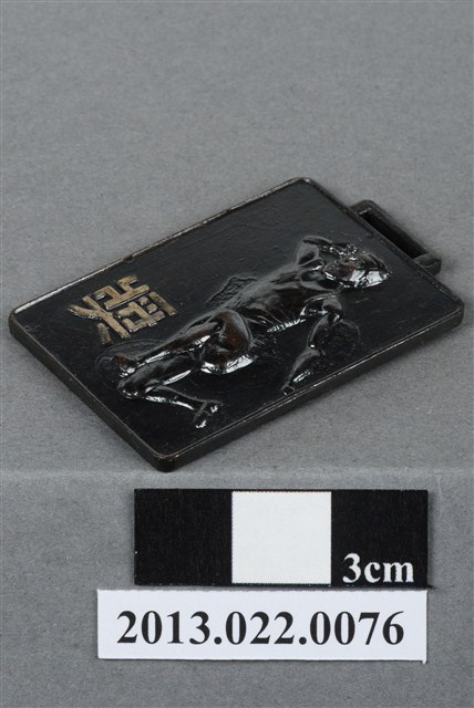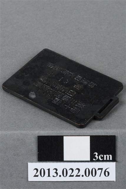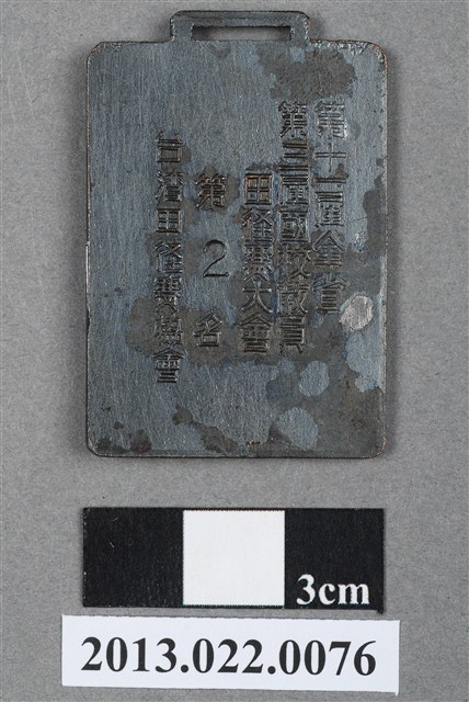 1.本物件為第11屆全省暨第3屆國校教員田徑賽大會第2名獎牌,金屬材質。獎牌正面有1男子呈現右膝跪地、左腳屈膝及右手高舉至頭的姿態圖樣,其右手與身體的比例差異過大。左下方有「獎」字樣。背面有「第十一屆全省」、「第三屆國校教員」、「田徑賽大會」、「第2名」、「臺灣田徑賽總會」字樣。本物件表面有鏽蝕現象。本件與登錄號2013.022.0075藏品相同。