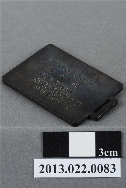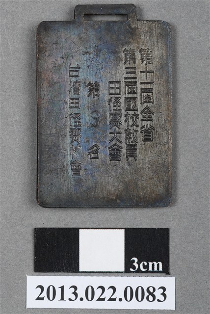 1.本物件為第11屆全省暨第3屆國校教員田徑賽大會第3名獎牌,金屬材質。獎牌正面有1男子呈現右膝跪地、左腳屈膝及右手高舉至頭的姿態圖樣,其右手與身體的比例差異過大。左下方有「獎」字樣。背面有「第十一屆全省」、「第三屆國校教員」、「田徑賽大會」、「第3名」、「臺灣田徑賽總會」字樣。本物件表面有鏽蝕現象。本件與登錄號2013.022.0077藏品相同。
