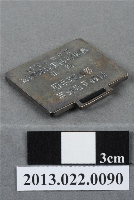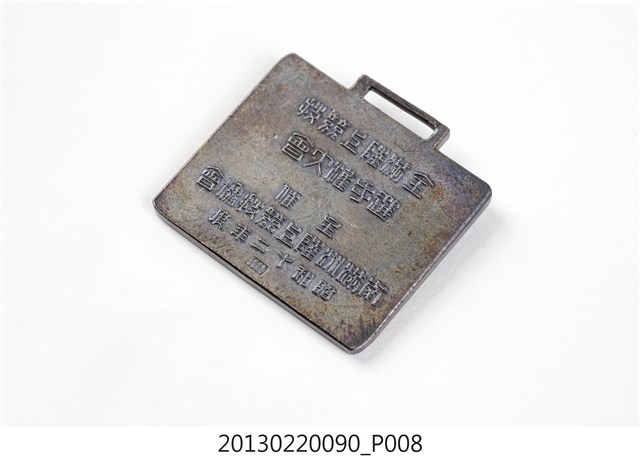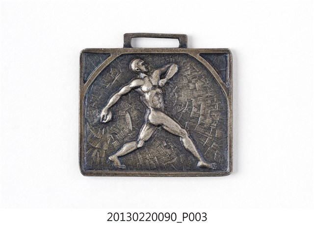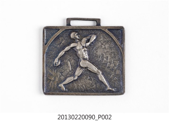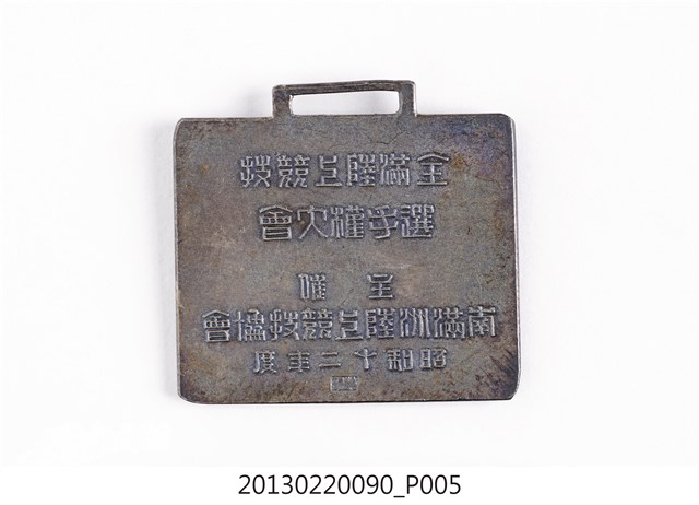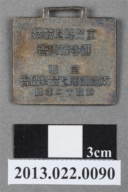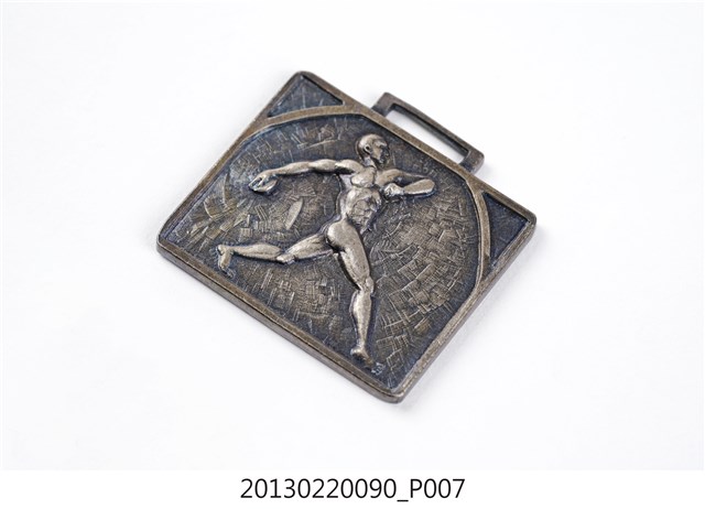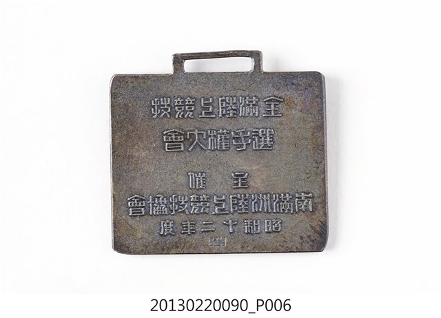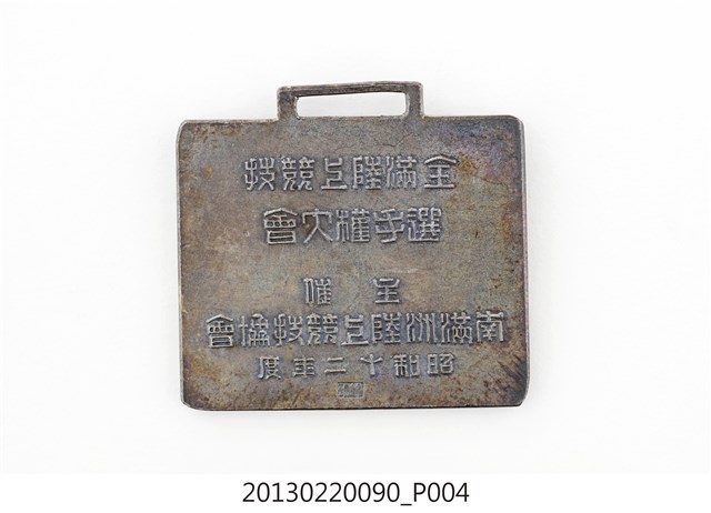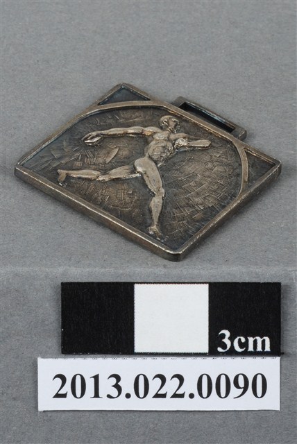 1.本物件為昭和12年(1937)全滿洲陸上競技選手權大會紀念章,金屬材質。紀念章正面有1男子做擲鐵餅姿態圖樣;背面有「全滿陸上競技」、「選手權大會」、「主催」、「南滿洲陸上競技協會」、「昭和十二年度」字樣。本物件表面有鏽蝕現象。本件與登錄號2013.022.0089藏品相同。