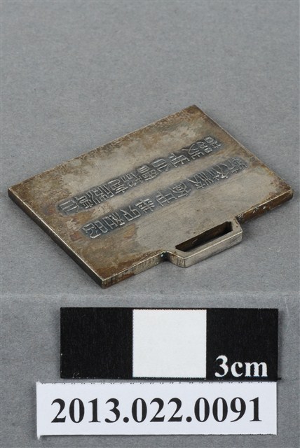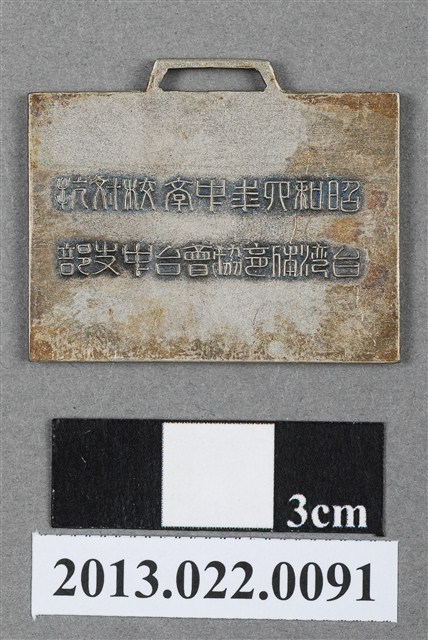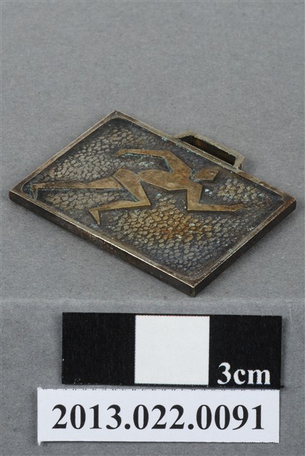 1. 昭和四年中學校對抗紀念獎牌為壓鑄法製成,呈扁平的長方形,雙面,獎牌上方有一馬蹄形孔洞,應可作為穿繩吊掛之用。獎牌整體圖案以浮雕、陽刻技法為主。獎牌正面浮雕一名男性跑者,男子上身前傾,雙手大幅度擺動,呈現田徑比賽的一瞬間。跑者身形以簡單的線條呈現,頗有幾何拼貼的效果。獎牌後方則佈滿細碎的圓形紋路,襯托出跑者剪影的身形姿態。獎牌背面陽刻兩行筆劃細緻的文字,上至下以篆書書寫:「昭和四年中學校對抗」以及「台灣體育協會台中支部」。2. 臺灣體育協會成立於1920年,主要統籌全臺灣的體育行政事務。隨著賽事舉辦,更在各市成立支部,承辦賽事以及分擔體協的行政事務。昭和四年臺灣所舉辦的支部對抗賽有軟式網球、棒球,而中等學校僅舉辦男、女子的軟式網球對抗賽。因此本面紀念獎牌可能為軟式網球對抗賽事之獎章。金屬制獎牌為大量製造之產品,壓鑄法的模具可重複使用,製作過程快,且厚度、尺寸掌握度高。